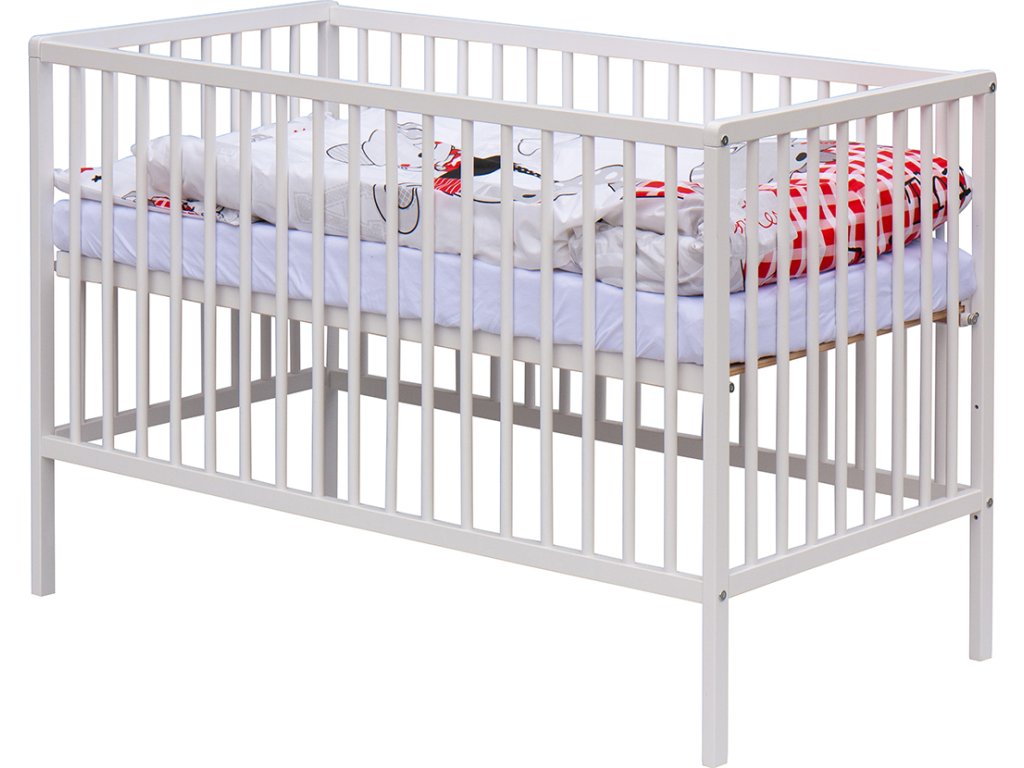 1. Dětská dřevěná postýlka 120x60 cm - bílá, masiv buk, 3 vyndavací příčky, 3 polohy roštu