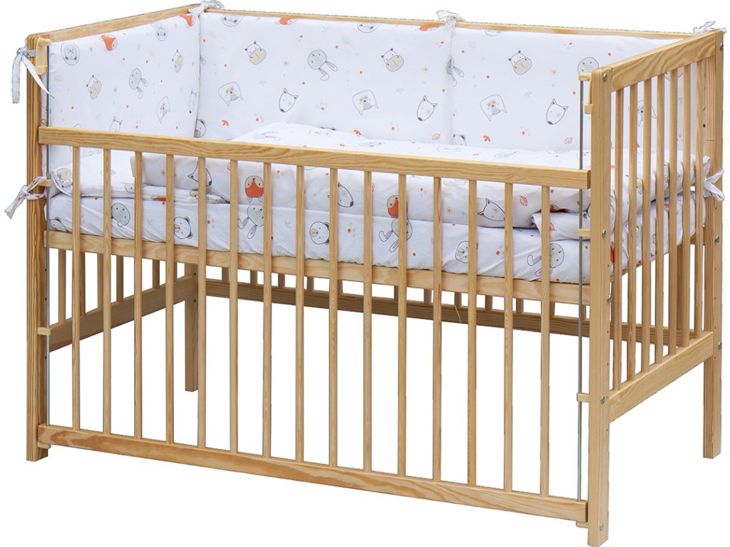 1. Dětská dřevěná postýlka 120 x 60 cm - přírodní, masiv borovice, stahovací bok, 6 poloh roštu