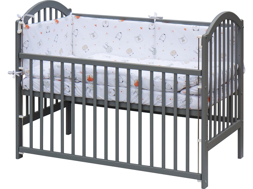 1. Dětská dřevěná postýlka 120 x 60 cm - šedá, masiv borovice, stahovací bok, 6 poloh roštu, nohy postýlky jsou předvrtané pro případné nasazení koleček