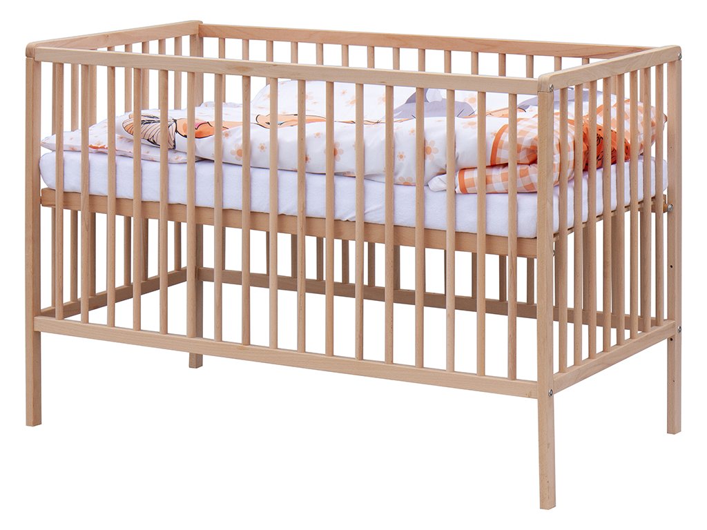 1. Dětská dřevěná postýlka 120 x 60 cm - přírodní, masiv borovice, 3 vyndavací příčky, 3 polohy roštu,