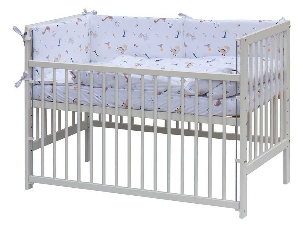 1. Dětská dřevěná postýlka 120 x 60 cm - bílá, masiv borovice, stahovací bok, 6 poloh roštu