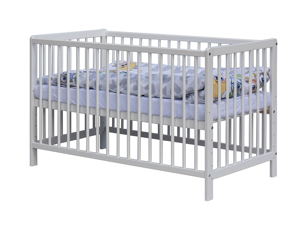 1. Dětská dřevěná postýlka 120x60 cm - bílá, masiv borovice, 3 vyndavací příčky, 5 poloh roštu