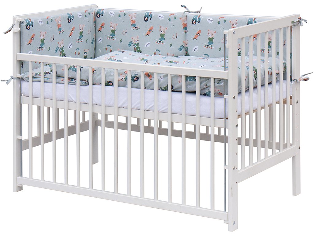 1. Dětská dřevěná postýlka 120 x 60 cm - bílá, masiv borovice, stahovací bok, 6 poloh roštu