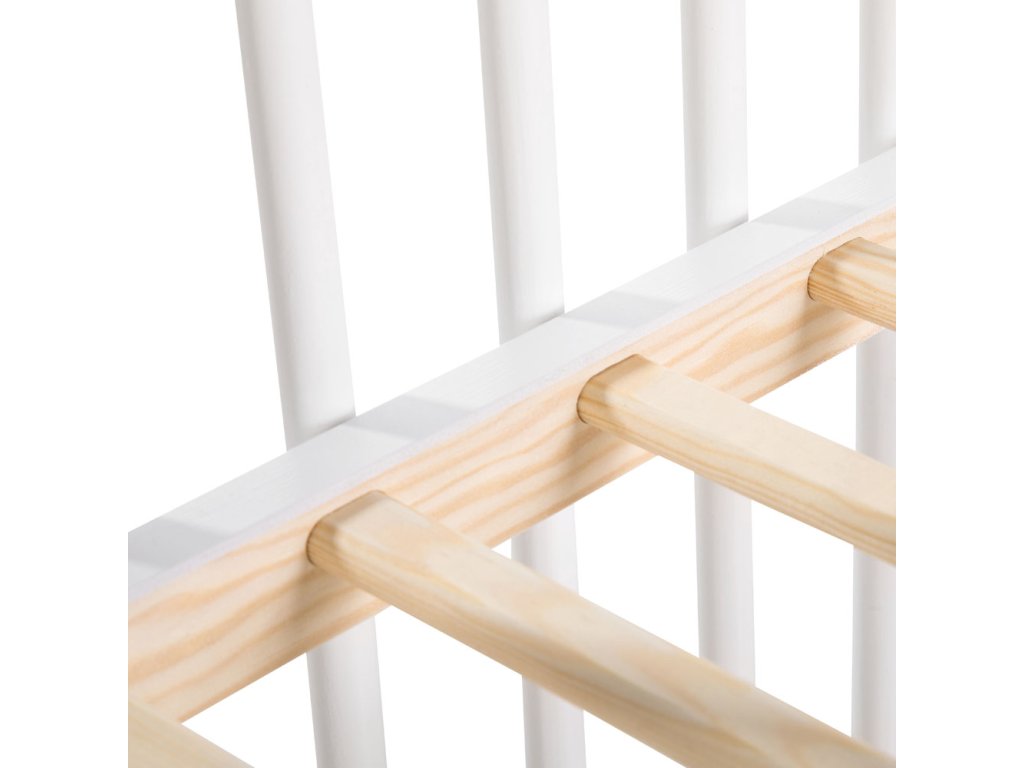 Mezi lamelami dna jsou volné mezery, díky nimž může vzduch neustále cirkulovat. Snadná cirkulace vzduchu v matraci především zajistí její hygienu a zachování jejích vlastností. Vyrobeno ze 100% borového dřeva z polských lesů. Tento prvek je možná nejvíce vystaven zatížení. Intenzivní hry v postýlce musí probíhat bez překvapení, takže jsme se ujistili, že dno vydrží mnoho let. Naše řešení se podobá tomu použitému po stranách, kde jsou proužky zapuštěny do otvoru pro něj určeného, a spojení je provedeno pomocí lepidla a sponek.