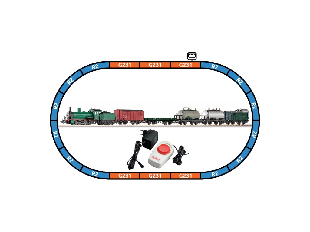 Startovací sada skládající se z parní lokomotivy 0‑8‑0 Rh 71 (G 7.1), pěti nákladních vozů, prodlouženého oválu a analogového ovládání s napájením. Lokomotivu lze dovybavit digitálním dekodérem, návazně také zvlášť určeným zvukovým modulem s reproduktorem, nebo i výrobníkem kouře. Koleje s podložím zajišťují vyšší odolnost a životnost při opakovaném rozebírání. Nákup sady je vhodné doplnit o příslušný spotřební materiál. Plocha základny: 158x88 cmMinimální konstrukční plocha: 168x98 cm Hlavní vlastnosti: analogové ovládánínapájení DCčtveřice náprav (lokomotiva)třínápravový tendrdvojice náprav (vagóny)světla bílé barvy s přepínáním dle směru jízdyrozhraní NEM 652šachta dle NEM 362 s kinematikou krátkého spřáhlakoleje s podložím Tato sada obsahuje: parní lokomotiva Rh 71 (G 7.1) SNCB III (1 ks)různé nákladní vozy SNCB III (5 ks)kolej oblouková R2 s podložím - 55412 (12 ks)kolej rovná G231 s podložím - 55401 (5 ks)kolej rovná G231 s podložím (přípoj pro napájecí svorku) - 55406 (1 ks)podloží pro napájecí svorku - 55447 (1 ks)napájecí svorka ke kolejím analogová - 55270 (1 ks)základní analogový ovladač s napájecím zdrojem - 55003 (1 ks) Dokumentace: ilustrační návod k obsluze a seznam náhradních dílů příbuzné soupravy č. 57123 (DE, EN, FR, NL, IT, ES, PL, RU, CN, CZ)ilustrační návod k obsluze a seznam náhradních dílů příbuzného modelu lokomotivy č. 57550 (DE, EN, FR, NL, IT, ES, PL, RU, CN, CZ)Sizing info