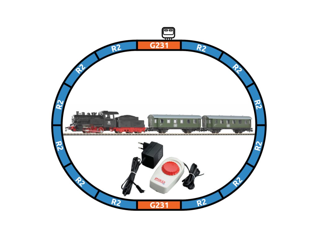 Startovací sada skládající se z parní lokomotivy 0-4-0 BR 98, dvou osobních vozů 2. třídy, základního oválu a analogového ovládání s napájením. Koleje s podložím zajišťují vyšší odolnost a životnost při opakovaném rozebírání. Nákup sady je vhodné doplnit o příslušný spotřební materiál. Plocha základny: 110x88 cmMinimální konstrukční plocha: 120x98 cm Hlavní vlastnosti: analogové ovládánídvojice nápravtřínápravový tendrspojovací hák v nestandardní šachtěkoleje s podložím Tato sada obsahuje: parní lokomotiva BR 98 s tendrem DB III - 50501 (1 ks)osobní vůz 2. třídy DB III (2 ks)kolej oblouková R2 s podložím - 55412 (12 ks)kolej rovná G231 s podložím - 55401 (1 ks)kolej rovná G231 s podložím (přípoj pro napájecí svorku) - 55406 (1 ks)podloží pro napájecí svorku - 55447 (1 ks)napájecí svorka ke kolejím analogová - 55270 (1 ks)základní analogový ovladač s napájecím zdrojem - 55003 (1 ks) Dokumentace: Návod k obsluze a seznam náhradních dílů soupravy č. 57112 (DE, EN, F, NL, ITA, E, POL, RUS, CHN, CZ)Návod k obsluze a seznam náhradních dílů modelu č. 50501 (DE, EN, F, NL, ITA, E, POL, RUS, CHN, CZ)Sizing info