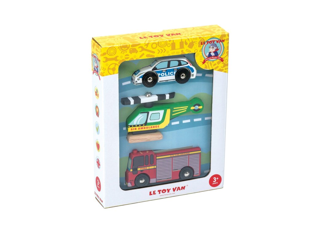 Tísňová linka, jak vám mohu pomoci? Dřevěná záchranářská auta jsou již na cestě! Tato nostalgická hračka děti inspiruje k představivé hře. Tři stroje z odolného kaučukového dřeva – záchranná helikoptéra, policejní a hasičské auto, jsou malovány netoxickými barvami na bázi vody. Produkt je kompatibilní s vláčky a vláčkodráhami Le Toy Van. Perfektní dárek pro mladé hasiče, pilotky, záchranáře a policistky. Hračky s účelemVšechny hračky firmy Le Toy Van jsou vyrobeny s cílem – aby dlouho vydržely. Designovány s láskou zkušenými řemeslníky za použití etických praktik a udržitelných materiálů, které jsou laskavější k naší planetě. Hlavní vlastnosti: vyrobeno eticky z udržitelného dřevatestováno dle nejpřísnějších standardůmalováno netoxickými barvami na bázi vodyinspiruje k představivé hřerozvíjí kognitivní dovednosti Auta & stavby: Stavební a motorická kolekce Le Toy Van, která vyhrála mnoho ocenění. Přesněji prozatím přes 15 ocenění za představivá auta a stavební hračky. Podporují dětskou fantazii, jsou ideální k představivé hře, rozvíjí kreativitu a hravě zlepšují dětskou koordinaci ruka‑oko.Sizing info