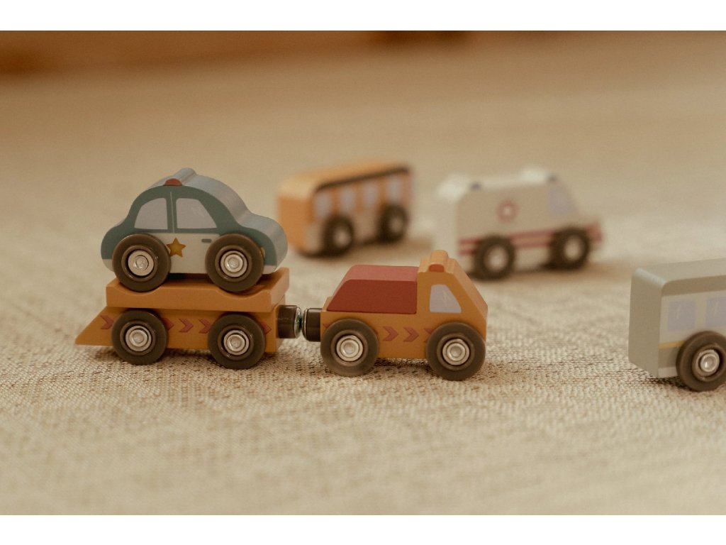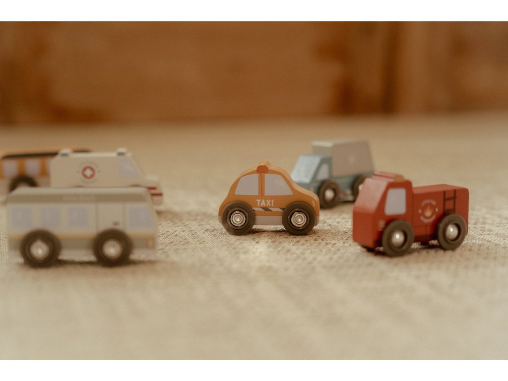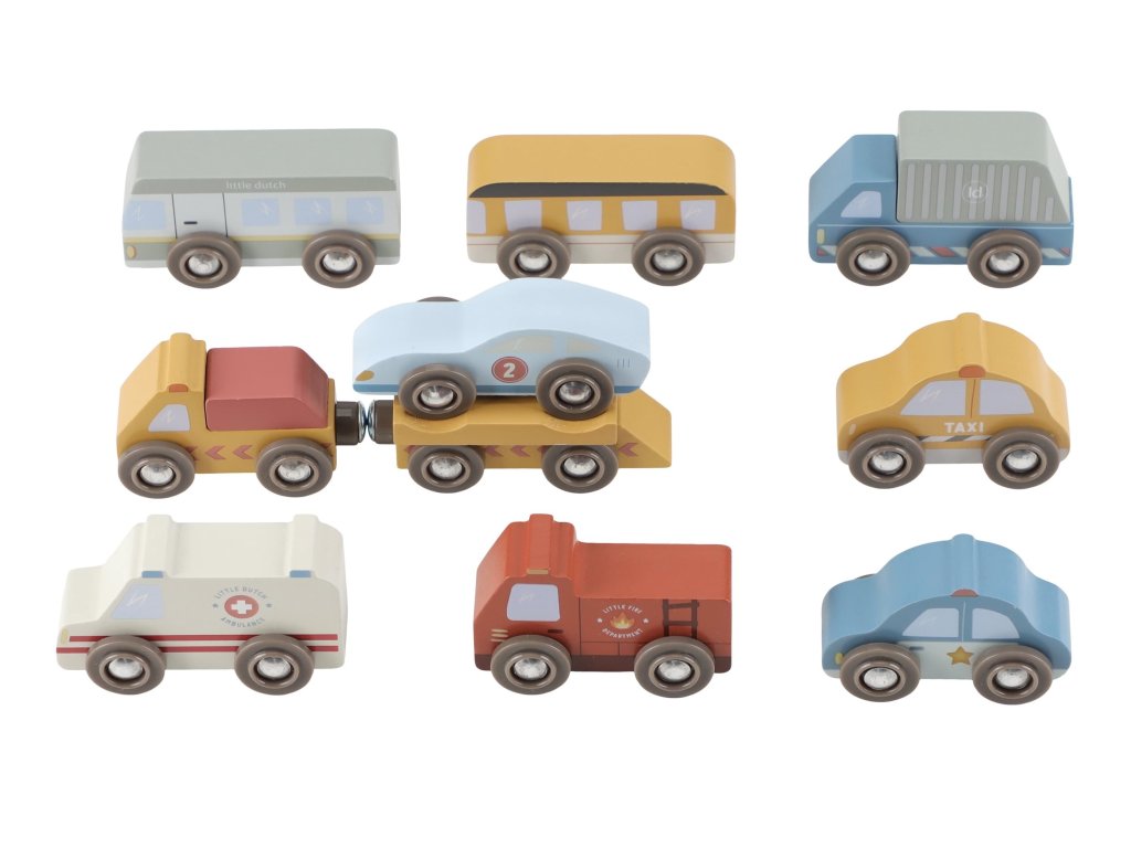 Město je pořád v pohybu! Tato sada dřevěných vozidel různých profesí je připravena vyrazit do akce a pomáhat tam, kde je třeba. Hasičské auto vyjíždí k požáru, policejní vůz hlídkuje po městě a nákladní auto dováží zásoby – každý den přináší nové dobrodružství. Autíčka jsou kompatibilní s vláčkodráhou Little Dutch a jejími rozšiřujícími sadami. Děti si tak mohou vytvořit vlastní město plné akce, příběhů a pohybu. Hra podporuje představivost, jemnou motoriku a samostatné vyprávění. Hračka je součástí kolekce vysoce kvalitních dřevěných hraček Little Dutch, navržených s důrazem na bezpečnost a originální design. Vyrobeno z odolného FSC certifikovaného dřeva. Sada obsahuje 10 vozidel. Vhodné pro děti od 2 let.Doplňkové parametry