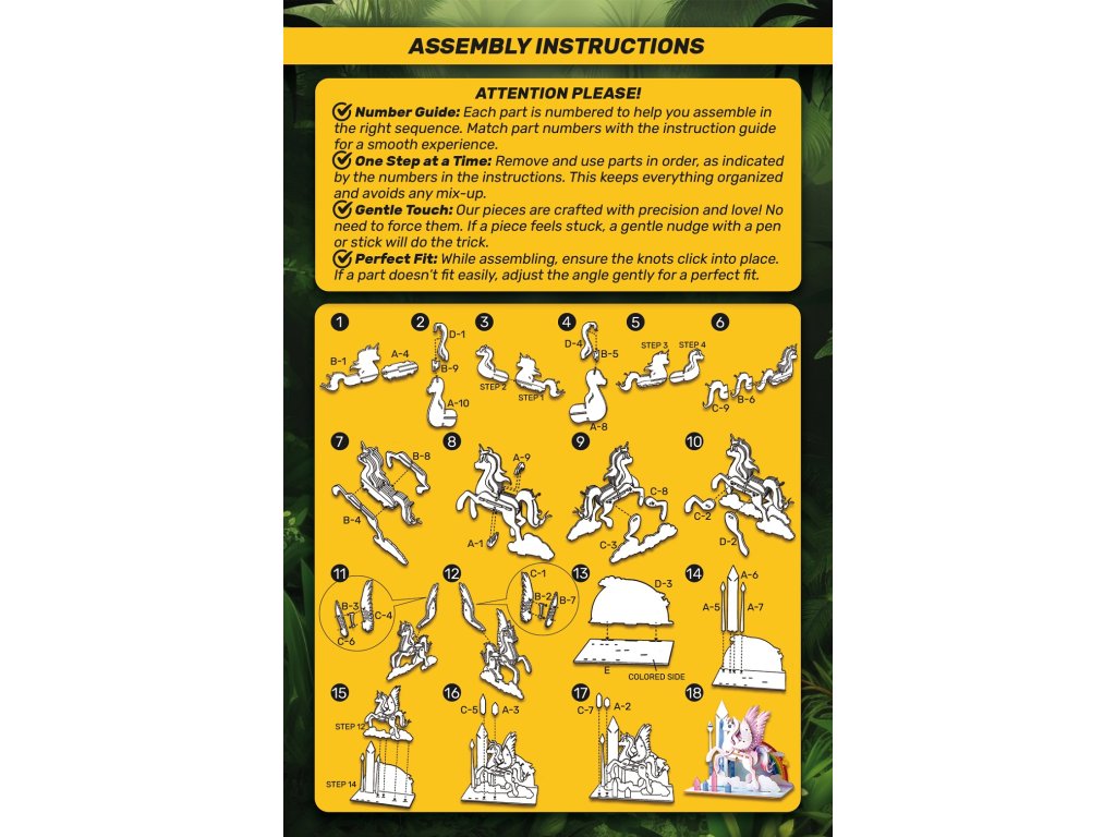 3D puzzle Jednorožec je pro děti zábavné a zároveň výzvou pro rozvoj jejich prostorové představivosti a logického myšlení. Rozvíjí se zároveň také jemná motorika. Toto dřevěné 3D puzzle obsahuje 33 dílků, které musí být správně složeny dohromady, aby vytvořily podobu oblíbeného jednorožce Jednotlivé díly z dřevěné překližky jednoduše vymáčknete a dle přiloženého návodu krok za krokem skládáte různé modely - dřevěné hračky. Puzzle nemusíte lepit lepidlem, pak je lze kdykoliv rozložit a znovu složit. Doporučujeme si proto ponechat návod ke stavbě. Barevné dřevěné 3D puzzle jsou opatřeny kvalitním potiskem. Tyto dřevěné hračky jsou určeny dětem od 8 let a splňují všechny normy EU.Tato stavebnice dětem poskytuje příležitost se dozvědět něco nového o jednorožcích a jejich magickém světě prostřednictvím zábavné a interaktivní hry. Upozornění: Není vhodné pro děti do 3 let, protože obsahuje malé součásti – hrozí nebezpečí udušení. Balicí materiál není hračka. Hlavní vlastnosti: přírodní dřevěné 3D puzzlerozvíjí jemnou motoriku a představivostvhodné od 8 letjednoduchá obtížnostSizing info