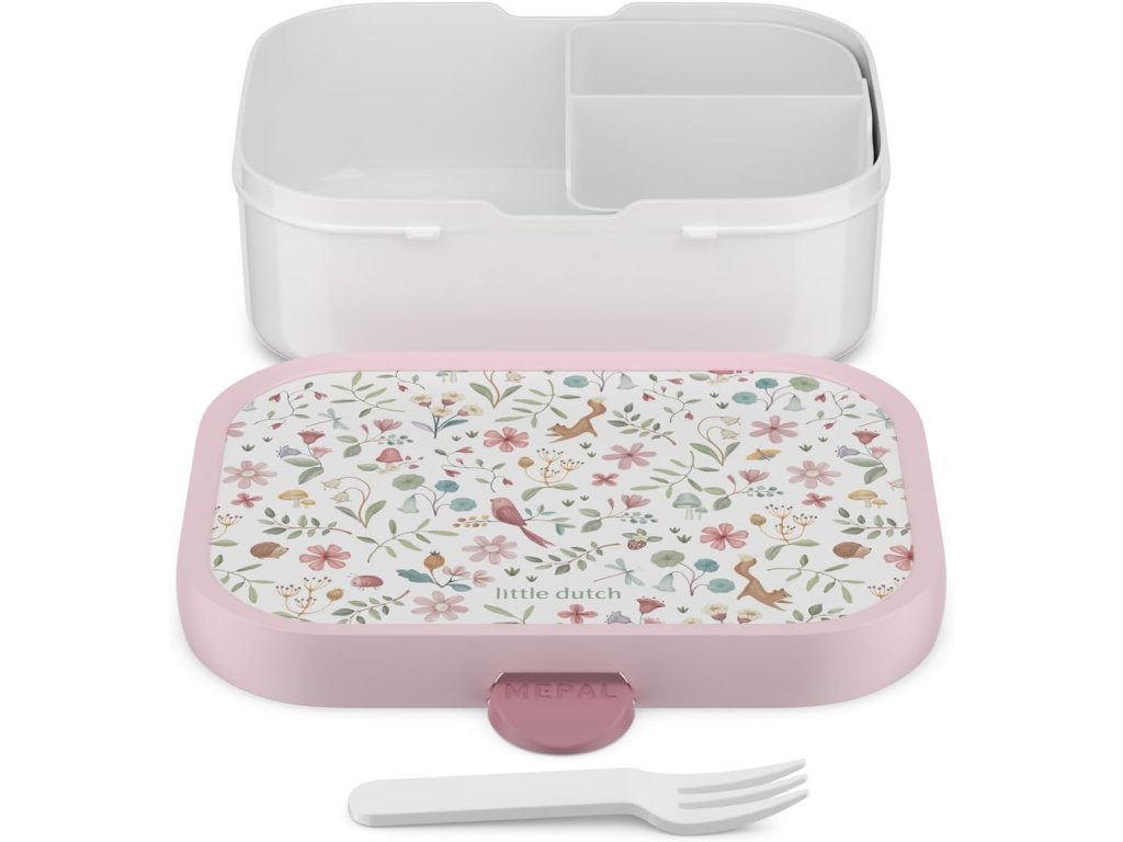 Praktický svačinový box nabízí možnost rozdělení na tři přihrádky pro oddělení jednotlivých částí uložené svačinky. Součástí boxu je i malá vidlička, která je ideální pro napichování kousků ovoce či zeleniny. Zacvakávací uzávěr je zárukou bezpečného uzavření obsahu boxu. Box je součástí designové řady hraček a doplňků Little Dutch Fairy Garden, inspirované životem na zahradě. Materiál: PP, ABS Rozměry: 17,8 x 13,2 x 6 cm Objem: 750 ml Vhodné do myčky.Doplňkové parametry