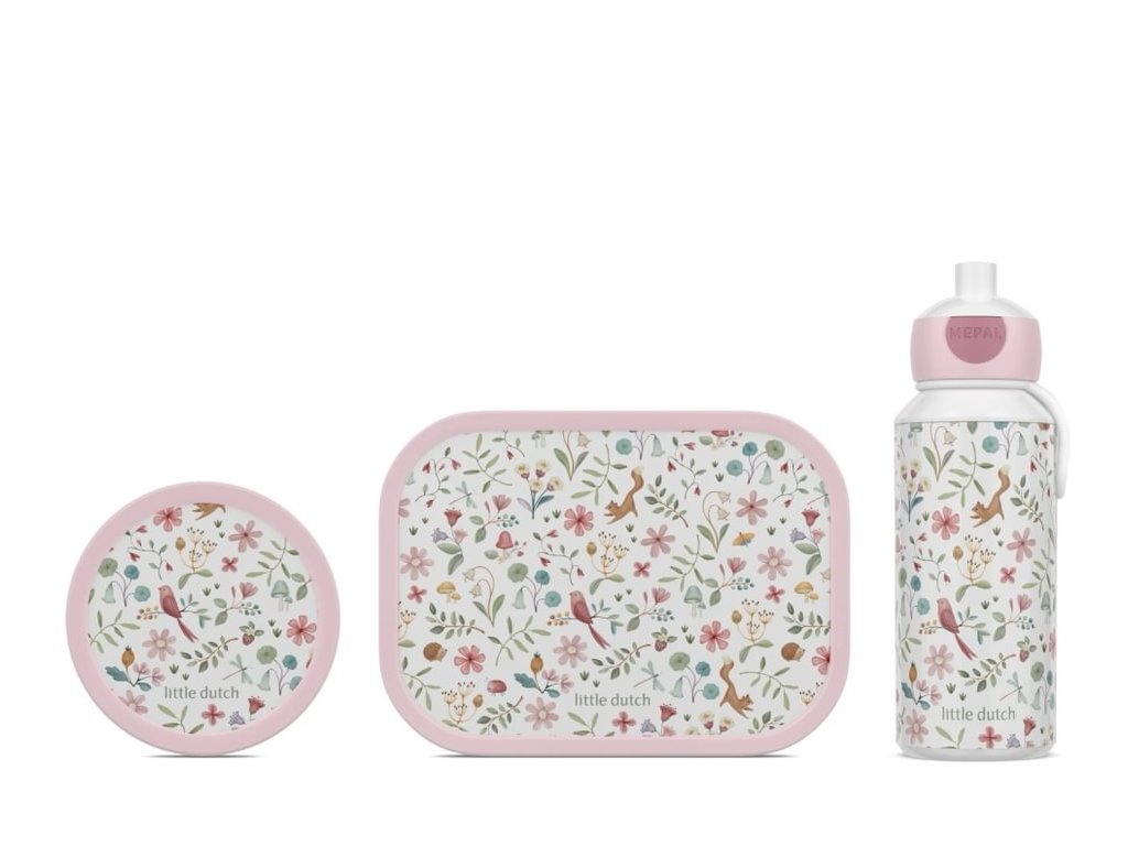 Svačinovou sadu tvoří láhev s vyskakovacím pítkem, svačinový box s možností rozdělení na tři přihrádky a box na ovoce. Stačí zmáčknout a můžete pít! Stisknete znovu a láhev je bezpečně zavřená! Unikátní láhev s vyskakovacím pítkem je jednoduchá na používání a zaručí vám, že obsah láhve nevyteče, kam nemá. Děti se ji naučí velmi rychle používat a může je tak provázet během všech aktivit, které během dne podnikají. Praktický svačinový box nabízí možnost rozdělení na tři přihrádky pro oddělení jednotlivých částí uložené svačinky. Součástí boxu je i malá vidlička, která je ideální pro napichování kousků ovoce či zeleniny. Zacvakávací uzávěr je zárukou bezpečného uzavření obsahu boxu. Praktický box na ovoce, nakrájenou zeleninou apod. má spolehlivé těsnicí víčko, které chrání obsah před vysypáním. Součástí boxu je i praktická malá vidlička, aby si vaše dítě mohlo vychutnat svoji svačinku bez zašpinění rukou. Sada je součástí designové kolekce hraček a doplňků pro děti Little Dutch Fairy Garden, inspirované životem na zahradě. Materiál: PP, ABS Objem láhve: 400 ml Rozměry boxu: 17,8 x 13,2 x 6 cm Rozměry boxu na ovoce: Ø 6,7 x 10,4 cm Objem boxu na ovoce: 300 ml Vhodné do myčky.Doplňkové parametry