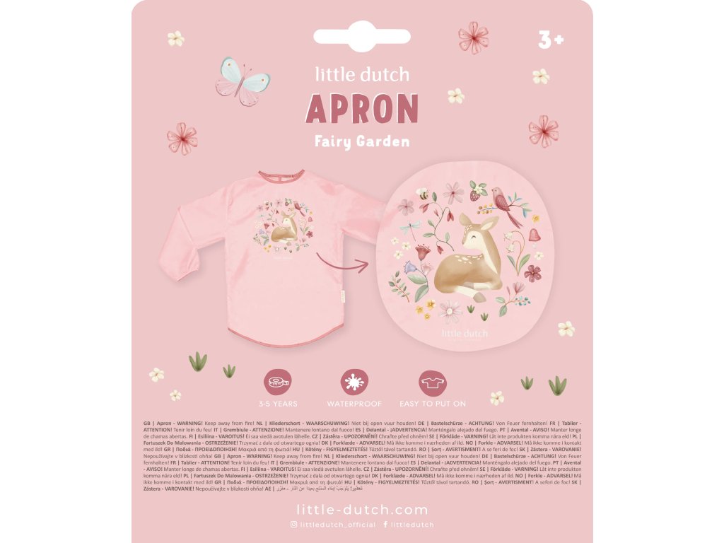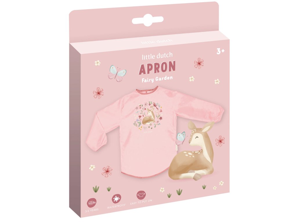 Když se vaše dítě pustí do malování, kreslení či jiného tvoření, barva může snadno skončit kdekoli na jeho oblečení. Tato lehká, voděodolná zástěra s dlouhými rukávy oblečení dítěte bezpečně ochrání. Díky zapínání na suchý zip vzadu a praktickým manžetám s gumičkou na rukávech se zástěra snadno obléká i svléká. Při znečištění stačí zástěru otřít vlhkým hadříkem. Zástěra s krásným potiskem je součástí designové kolekce hraček a doplňků Little Dutch Fairy Garden, inspirované životem na zahradě. Materiál: polypropylen Vhodné pro děti cca od 3 do 5 let.Doplňkové parametry