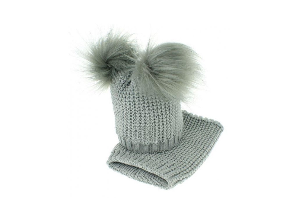 Zimní čepička s komínkem - chlupáčkové bambulky - šedá