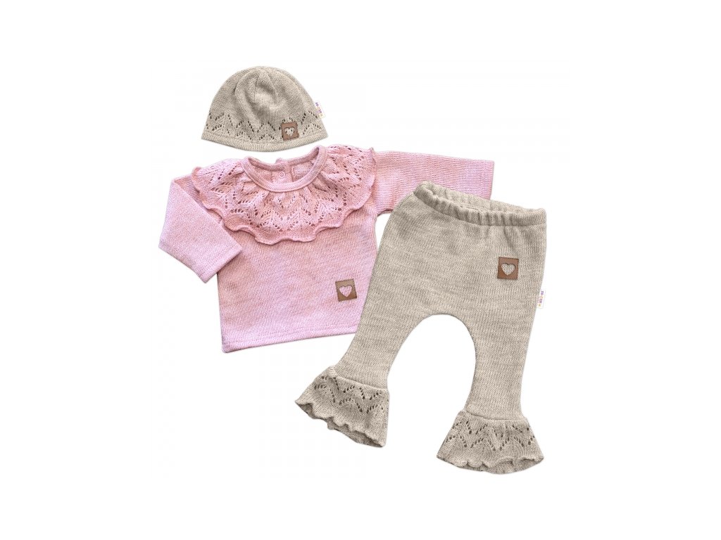 Pletená soupravička s volánkem Heart, 3D, kabátek, kalhoty a čepička, růžová/béžová