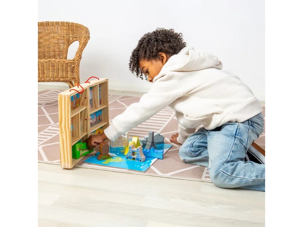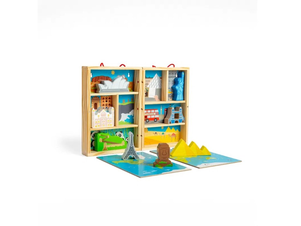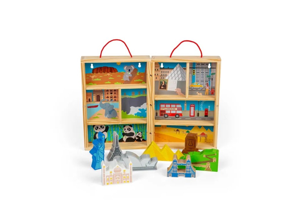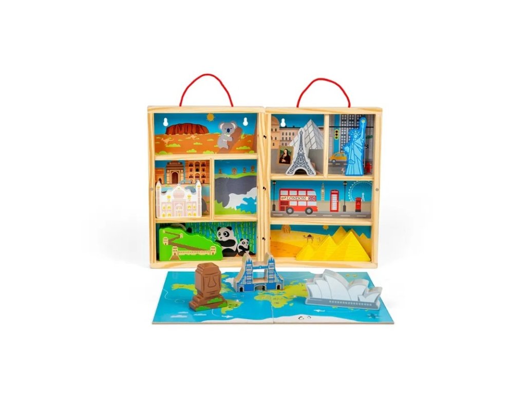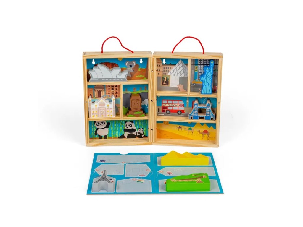 Malí cestovatelé mohou objevovat celý svět z pohodlí domova! Sada obsahuje nejznámější destinace a slavné památky od egyptských pyramid a Velké čínské zdi po australskou operu v Sydney a londýnský Tower Bridge a rozkládací mapu, kterou lze po skončení hry uložit do magnetické krabičky s uchy pro snadné přenášení. Díky tomuto praktickému balení je vhodná i na cesty. Je vyrobena z prvotřídního a udržitelného dřeva s certifikací FSC® a nabarvena netoxickými barvami a laky. Splňuje aktuální evropské bezpečnostní normy. Hlavní vlastnosti: uloženo v dřevěném boxu s magnetickým zavíráním a uchyobsahuje 10 dílů (památky a mapa)vyrobeno ze dřeva s certifikací FSC®vhodné i na cestyod 18 měsíců věku Značka a certifikát FSC® (Forest Stewardship Council) zaručuje, že dřevo, ze kterého byl produkt vyroben, nebylo vytěženo nelegálně a pochází z lesů obhospodařovaných šetrným či přírodě blízkým způsobem, ve kterém jsou dodržovány přísné environmentální a sociální požadavky. Značka FSC® na výrobku znamená, že svým nákupem pomáháte chránit lesy a podporujete šetrné, odpovědné či přírodě blízké hospodaření, díky kterému jsou naše lesy stabilnější, zdravější, mají přirozenou druhovou skladbu a lépe odolávají negativním následkům klimatických změn.Sizing info