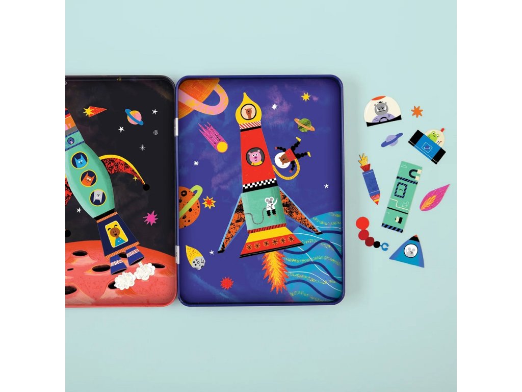 Magnetická sada obsahuje 2 ilustrované scény a 3 archy různých magnetů na sestavení rakety. Hra nabízí hodiny nápaditého hraní, při kterém dítě rozvíjí představivost a kreativitu. Plechový obal se snadno sbalí do batůžku jako cestovní hračka. Hlavní vlastnosti: skvělá cestovní hračka v kovové krabičcesnadno se čistí3 archy různých magnetů2 ilustrované scényvšechny produkty Mudpuppy splňují bezpečnostní normy CPSIA, ASTM, CESizing info