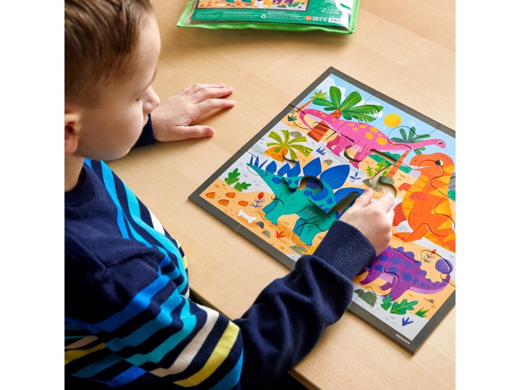 Objevte pravěký svět s dinosaury. 12dílné puzzle „Silní dinosauři“ je zábavná a vzdělávací hračka pro děti, která propojuje skládání obrázku s oblíbeným tématem dinosaurů. Puzzle je navrženo pro děti, aby rozvíjely své jemné motorické dovednosti a logické myšlení. Tato skládačka obsahuje 12 extra silných dílků a je zabalena v bezpečném, opakovaně použitelném sáčku s lemovkou a zipem, pro snadné skladování i cestování. Puzzle jsou vyrobeny za použití významného podílu recyklovaného papíru a nabízí špičkový potisk nezávadnými barvami. Jsou opatřeny matnou povrchovou úpravou, která zajišťuje za všech okolností věrné podání detailů i barev. Jejich zadní strana je potažena hladkým, na dotek příjemným povrchem, díky němuž se při skladování rozloženého puzzle netvoří prach. Hlavní vlastnosti: 12 precizně vyřezaných dílkůvyrobeno s použitím recyklovaných a udržitelně získaných materiálůpečlivě vybraný motiv od renomovaných tvůrců a umělcůpotisk a provedení nejvyšší kvalityobsahuje návodný obrázekSizing info