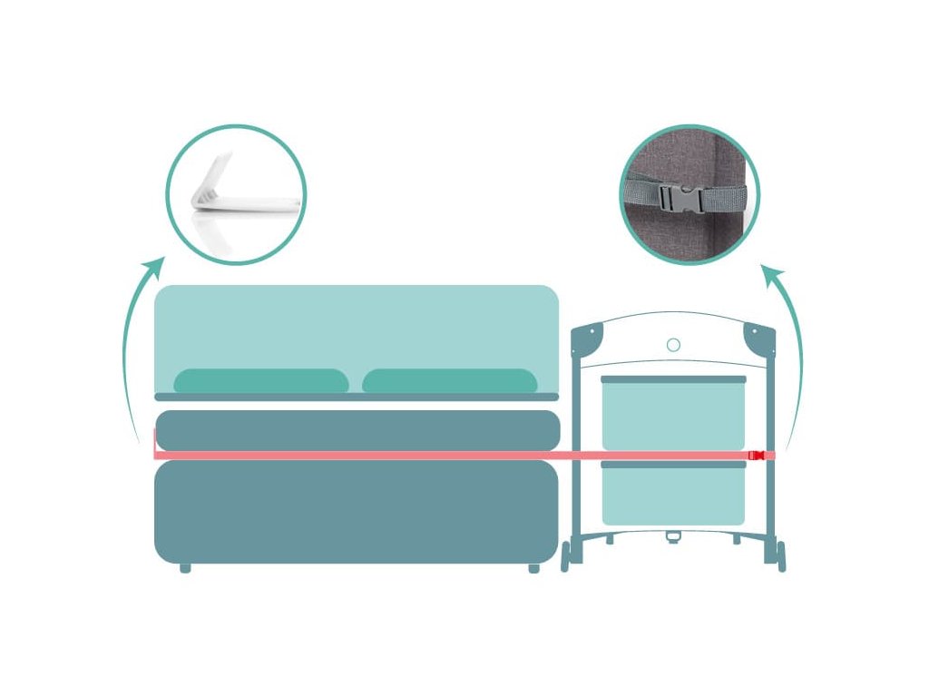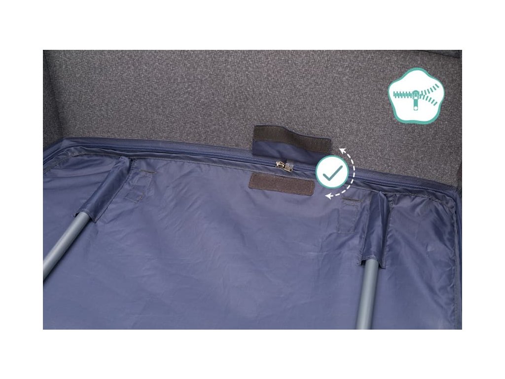 Tato postýlka má tři stabilní nohy a dvě praktická kolečka s brzdou, takže postýlku můžete snadno přemisťovat po pokoji. Boční část tvoří prodyšná síťovina, která zaručuje klidnější spánek. Díky praktickému průlezu na široké straně postýlky vaše dítě samo vyleze. Průlez lze snadno otevřít a zavřít pomocí zipu. Postýlka má výškově nastavitelné dno.