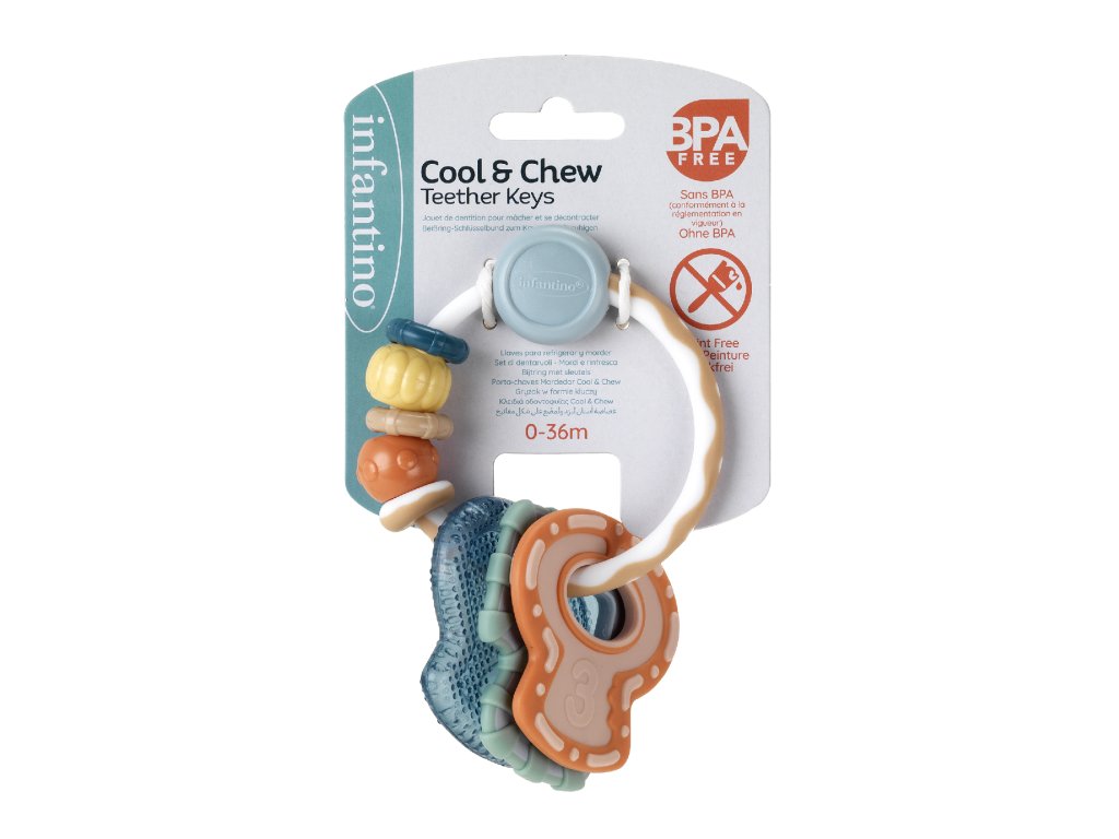 Chrastítko Infantino v podobě kroužku s posuvnými korálky a klíčky, které slouží i jako kousátka pro úlevu při prořezávání prvních zoubků. Kousátka mají různé povrchy (měkčí i pevnější) a je možné je ochladit v lednici pro větší úlevu při růstu zoubků. Hračka při pohybu jemně chrastí. Chrastítko podporuje rozvoj jemné motoriky dítěte i jednotlivých smyslů. Vhodné pro děti od narození.Doplňkové parametry