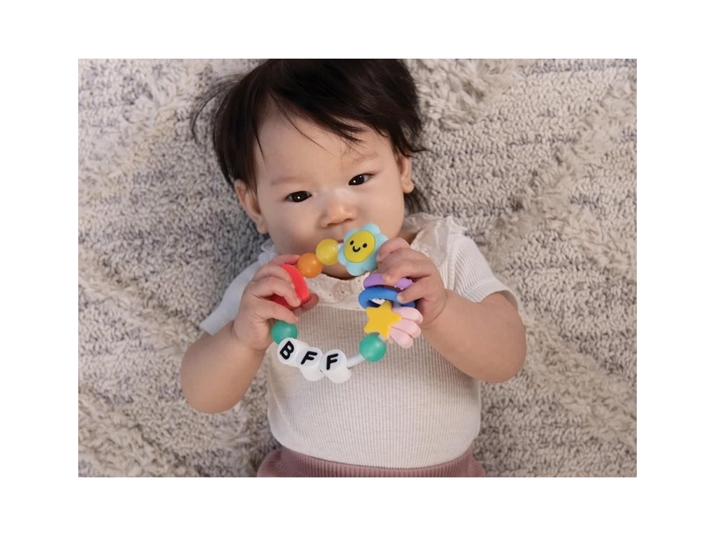 Krásné kousátko v podobě náramku je vyrobeno z pružného měkkého silikonu. Různorodé textury lákají dítě ke zkoumání v ústech, masírováním dásní kousátko pomáhá dítěti při prořezávání prvních zoubků. Tvar kousátka umožňuje snadné držení malými dětskými ručičkami. Rozměry: průměr 11 cm Neobsahuje BPA. Vhodné pro děti od narození.Doplňkové parametry