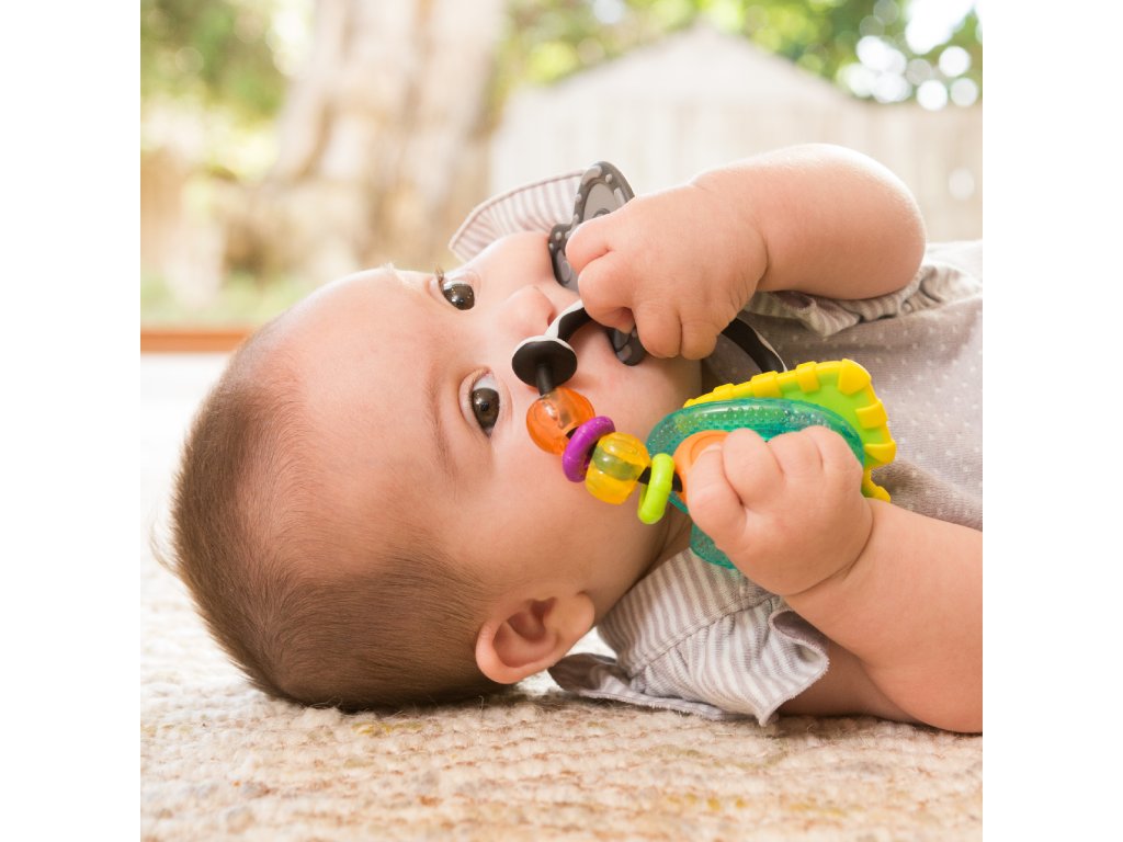 Chrastítko a kousátko ve výrazných barvách dítě zabaví i uleví jeho citlivým dásním při prořezávání zoubků. Tvar hračky umožňuje snadné uchopení dětskými ručičkami. Vhodné od narození.Doplňkové parametry