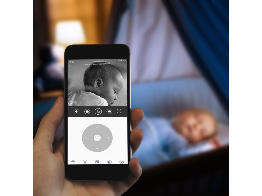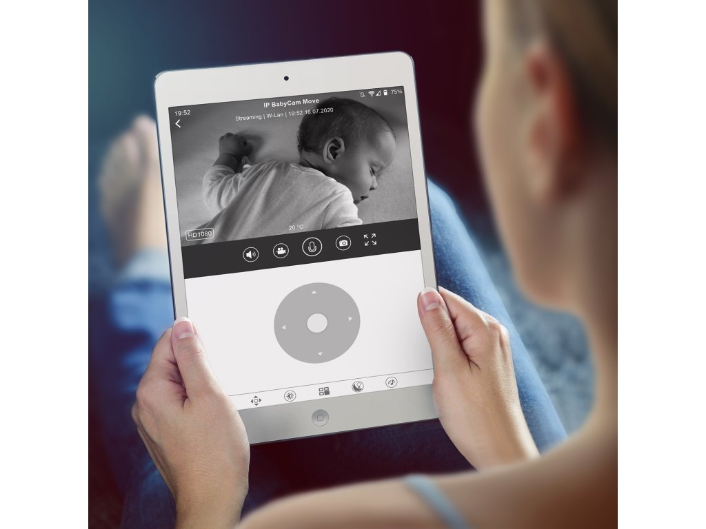Abyste mohli používat své mobilní zařízení jako rodičovskou jednotku pro IP BabyCam Move, musíte si nejprve stáhnout bezplatnou aplikaci z obchodu s aplikacemi nebo z GooglePlay, v závislosti na operačním systému. Po několika kliknutích jsou IPCam a vaše zařízení vzájemně propojeny a přenos může začít. K vašemu smartphonu lze také připojit několik kamer. Fotoaparát může odesílat data do více mobilních zařízení. Například prarodiče mohou sledovat svého malého miláčku, jak klidně spí.