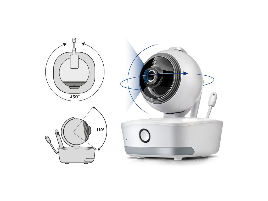 Pohybující se kameru lze plynule otáčet o 330 ° a naklánět až o 110 °. Tento panoramatický pohled umožňuje prohlížení velkých ploch a vy máte svého drobečka vždy na dohled. Díky stojanu s nástěnným držákem lze IP BabyCam Move snadno umístit na zeď, na strop nebo na stůl.