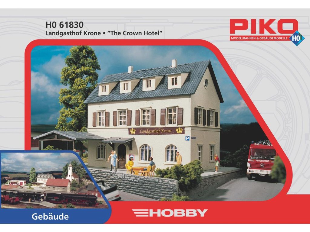 Video je pouze ilustrační, zobrazuje příbuzný produkt. Hostinec a penzion Koruna ze série modelů PIKO HOBBY nabízí mezi členitými detaily především letní terasu. Ostatní předměty zachycené na obrázku (auta, figurky atd.) nejsou součástí stavebnice. Plastikové miniatury PIKO naleznou uplatnění při návrzích realistických kolejišť a dioramat. Propracovanou barevností napodobují své předlohy s maximální věrností. Detailní a přesné plastové výlisky jednotlivých dílů do sebe hladce zapadají a díky detailnímu návodu přiloženému ke každé stavebnici je sestavení snadné, můžete tak svůj cenný čas věnovat jedinečnému návrhu krajiny a rozložení jednotlivých prvků na scéně. Mezi příslušenstvím nabízeným k těmto modelům naleznete rozmanité doplňky, spotřební materiál i průvodce s návody a cennými radami pro návrhy kolejišť. Hlavní vlastnosti:měřítko H0 (1:87)realistické barvysnadné sestavení Dokumentace:návod k sestavení modelu č. 61830Sizing info