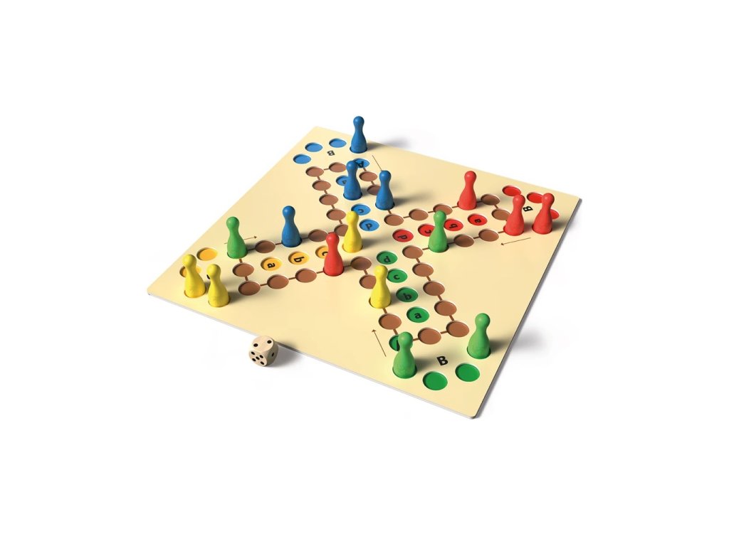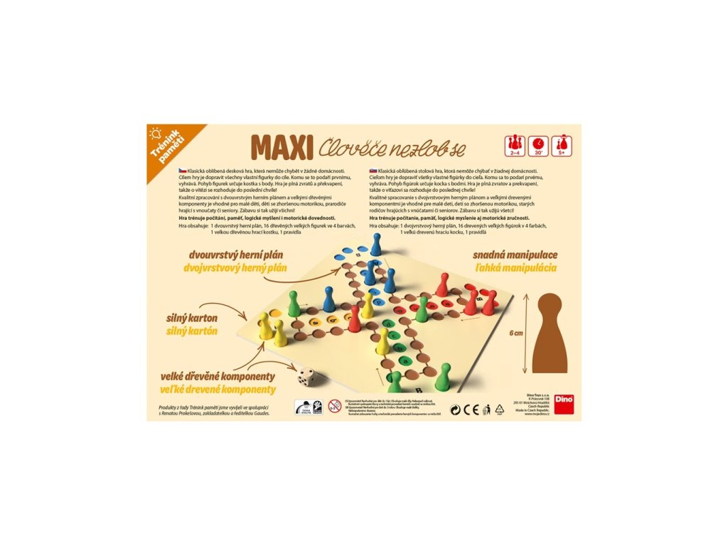 Oblíbená desková hra, která nemůže chybět v žádné domácnosti! Cílem hry je dopravit všechny vlastní figurky do díle. Komu se to podaří jako prvnímu, vyhrává. Hra je plná zvratů a překvapení, takže o vítězi se rozhoduje do poslední chvíle. Díky kvalitně zpracovanému dvouvrstvému hernímu plánu a velkým dřevěným komponentům je hra vhodná pro hraní s malými dětmi a také s osobami se zhoršenou motorikou a seniory. Obsah balení: 1 herní plán16 velkých dřevěných figurek ve 4 barvách1 hrací kostkanávod ke hře Hlavní vlastnosti: trénuje paměť, počítání a logické myšlenícvičí jemnou motorikuvhodné pro děti od 5 letvyrobeno v ČR Zkrácený návod ke hřeHráči házejí kostkou a podle počtu hozených bodů posouvají své figurky do cíle. Vyhrává ten, kdo dostane všechny figurky do domečku jako první.Sizing info