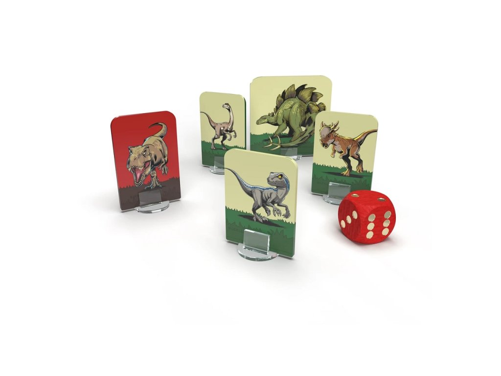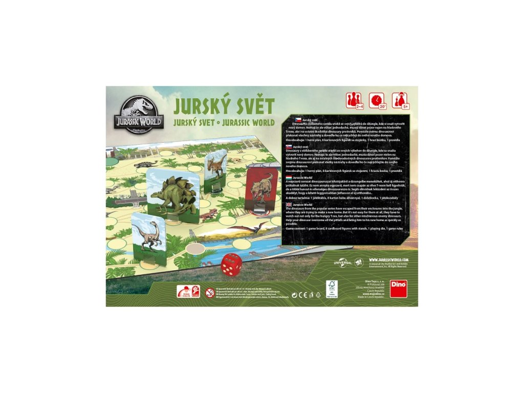 Dinosauři z oblíbeného seriálu Jurský svět utekli ze svých výběhů a teď se protloukají nebezpečnou džunglí, kde se snaží vytvořit nový domov. Ale pozor – hladový T-rex a další mazaní protivníci Vám to rozhodně neulehčí! Vyhýbejte se překážkám, chytře pokládejte nástrahy a překvapte své soupeře, abyste dorazili do bezpečí jako první! Zábavná hra pro všechny malé dobrodruhy a milovníky dinosaurů od 5 let. Obsah balení: 1 herní plán8 kartonových figurek se stojánky1 hrací kostka1 pravidla Hlavní vlastnosti: vhodné od 5 let věkurozvíjí představivost, strategické myšlení procvičuje jemnou motorikupodporuje kreativitu a představivost vyrobeno v ČRSizing info