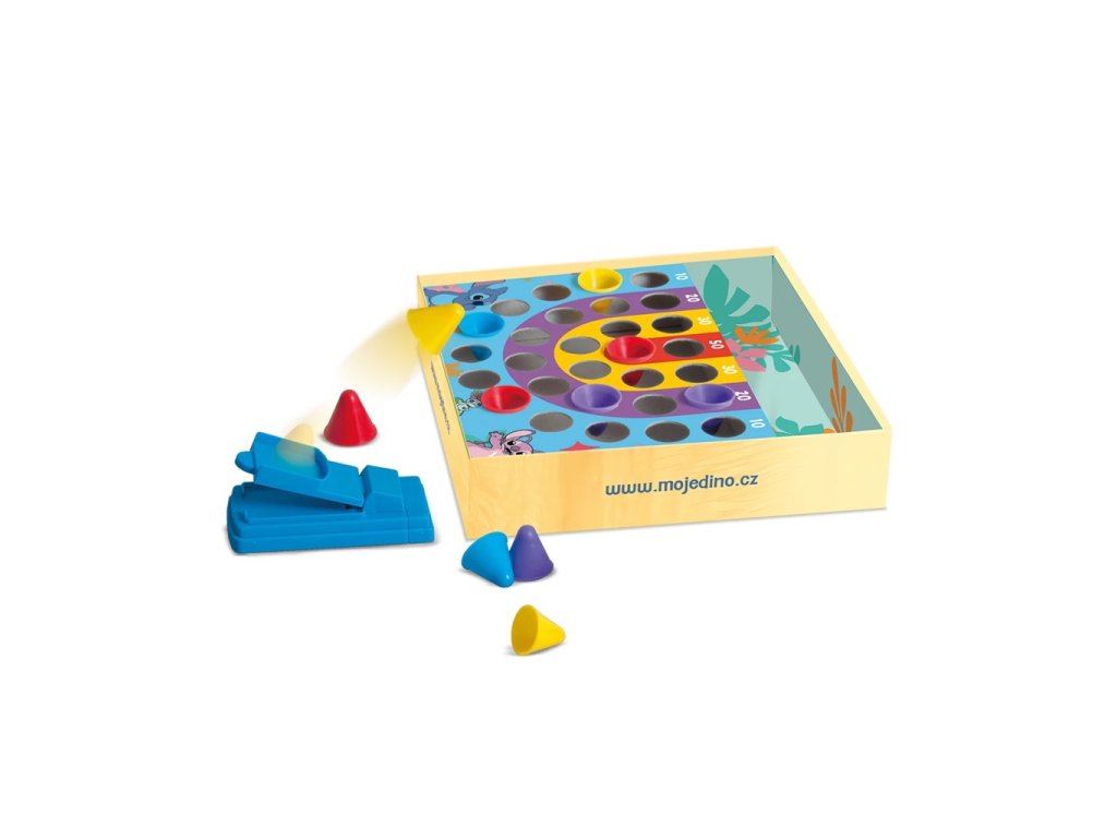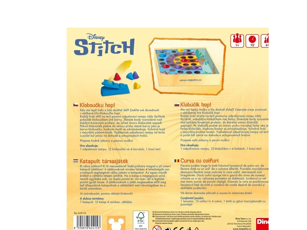 Oblíbená retro hra v novém designu populární licence Stitch. Proleťte se vesmírem s nezbedným bláznivým Stitchem a jeho kamarádkou Angel a u toho potrénujte dobrou mušku, zručnost, motoriku i počítání. Každý klobouček v terči se počítá, a když se vám podaří umístit barvu kloboučku do stejné barvy v terči, máte dvojnásobek bodů. Díky stabilní odpalovací rampě zvládnou hrát děti již od 4 let. Zahrajte si sami, nebo poměřte své dovednosti s kamarády. Kdo má nejlepší mušku? Obsah balení: 1 odpalovací rampa12 kloboučků ve 4 barvách1 hrací terč Hlavní vlastnosti: text v češtině, slovenštině a maďarštinězábavná hratrénuje motorické dovednostivhodná pro děti od 4 letvyrobeno v ČR Zkrácený návod ke hřeKaždý hráč střílí na terč pomocí odpalovací rampy vždy čtyřikrát, pokaždé kloboučkem jiné barvy. Sbírejte body vyznačené nad každým barevným pruhem, do jehož otvoru klobouček zapadl. Pokud klobouček padne do otvoru pruhu stejné barvy jako je barva kloboučku, hodnota bodů se zdvojnásobuje. Vyhrává hráč s největším počtem bodů.Sizing info