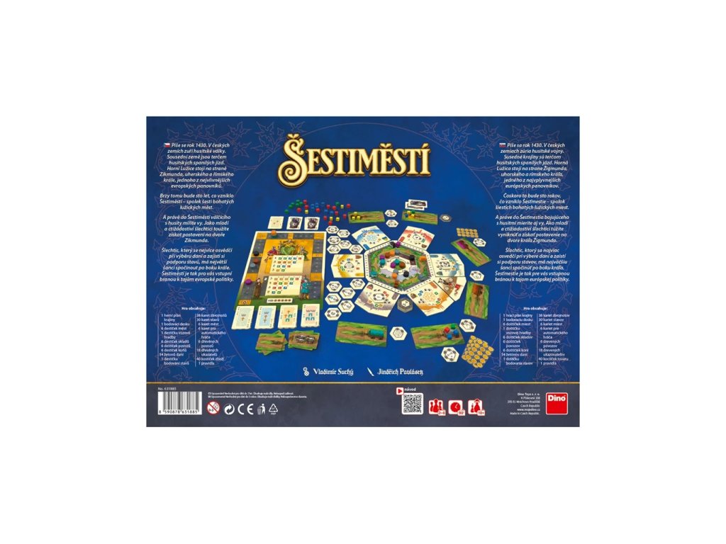Píše se rok 1430 a v českých zemích zuří husitské války. Šest bohatých lužických měst se spojilo na ochranu obchodu před loupeživými rytíři a utvořilo takzvané Šestiměstí. Hráči v roli mladých ctižádostivých šlechticů touží získat postavení na dvoře krále Zikmunda. Pouze ten, který se nejvíce osvědčí při výběru daní a zajistí si podporu stavů, má šanci spočinout po jeho boku. Objíždíte města, vybíráte v nich daně a nashromážděný majetek vozíte do královských a stavovských skladů. Tím získáváte body královské přízně i podporu jednotlivých stavů. Hra trvá 6 kol a každé kolo má 6 fází. Je jen na Vás, jakou strategii zvolíte. Je několik cest k vítězství. Rodinná hra od známého designéra Vládi Suchého Vám přichystá mnoho zábavy, strategických rozhodnutí, rozvine logické i kombinační schopnosti a potrénuje Vašeho vyjednávacího i obchodního ducha. Hra má několik variant obtížnosti, skvělou znovu hratelnost i pravidla pro hru dvou hráčů. Obsah balení: herní plán, bodovací deska, 6 destiček měst, destička vozové hradby, 6 destiček skladů, 6 destiček povozů, 6 destiček koní, 54 žetonů daní, destička bodování stavů, 38 karet zbrojnošů, 30 karet stavů, 6 karet měst, 6 karet pro automatického hráče, 6 dřevěných povozů, 18 dřevěných ukazatelů, 40 kostiček zboží, pravidla hry. Hlavní vlastnosti: zábavná strategická hratexty v češtině a slovenštiněpro 2 až 6 hráčůdoba hry 90 minutvhodné od 10 let Zkrácený návod ke hře Otočte karty stavů, vylosujte napadená města a umístěte žetony daní. Soupeřte o města, ve kterých budete vybírat daně (v pořadí podle šipky). Stanovte pořadí pro výběr daní. Ukazatele hráčů se přeskládají podle toho, kolik zbrojnošů hráči při výběru města použili. Zvolte formy vybírání daní (v pořadí dle šipky).V pořadí podle počtu získaných koňů postupně zvolte, v jakém pořadí naplníte sklady, a získáte za to přízeň s případnými bonusy. Vítězem hry se stává ten výběrčí daní, který získal nejvíce bodů přízně, a tedy nejvyšší postavení na dvoře krále Zikmunda.Sizing info