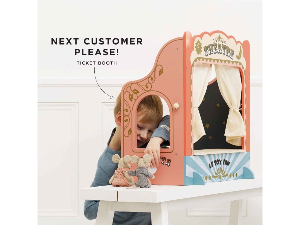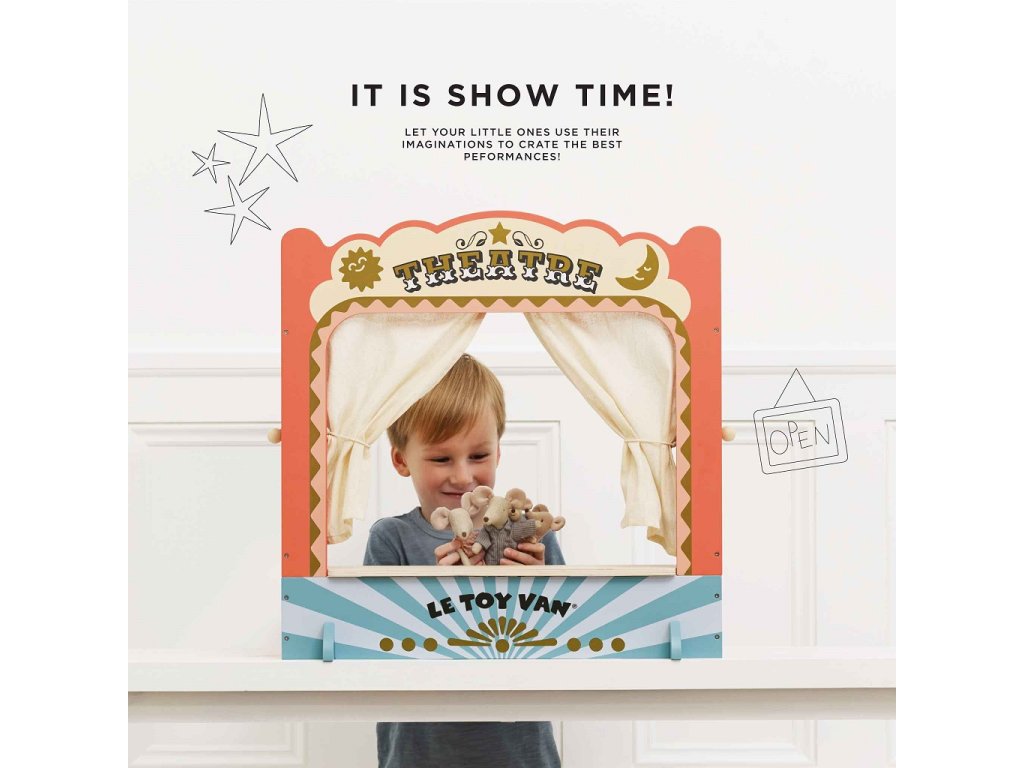 Představte si scénu, kde se Vaše děti ztrácejí ve světě fantazie a příběhů. Toto klasické loutkové divadlo je vyrobeno z kvalitního dřeva s certifikátem FSC® a zdobí ho látkové opony, které dodávají představení autentičnost. Je dekorováno zlatými detaily. S tímto divadlem se každý den promění ve vzrušující dobrodružství, kde děti mohou být kreativní, vyprávět příběhy a vytvářet nekonečné scénky. Pro ty, kdo mají omezený prostor, je tato kompaktní verze loutkového divadla ideální volbou. Je kompletní s okénkem na předprodej vstupenek a popisovací tabuli k uvedení přestavení. Uvnitř tohoto loutkového divadla se dá otevřít nádherná noční scéna s hvězdami, která vytvoří magickou atmosféru a rozjasní fantazii. Hračky s účelemVšechny hračky firmy Le Toy Van jsou vyrobeny s cílem – aby dlouho vydržely. Designovány s láskou zkušenými řemeslníky za použití etických praktik a udržitelných materiálů, které jsou laskavější k naší planetě. Hlavní vlastnosti: tradiční hračka pro rozvoj představivostimalováno netoxickými barvami se zlatými detaily vyrobeno ze dřeva s certifikací FSC® Značka a certifikát FSC® (Forest Stewardship Council) zaručuje, že dřevo, ze kterého byl produkt vyroben, nebylo vytěženo nelegálně a pochází z lesů obhospodařovaných šetrným či přírodě blízkým způsobem, ve kterém jsou dodržovány přísné environmentální a sociální požadavky. Značka FSC® na výrobku znamená, že svým nákupem pomáháte chránit lesy a podporujete šetrné, odpovědné či přírodě blízké hospodaření, díky kterému jsou naše lesy stabilnější, zdravější, mají přirozenou druhovou skladbu a lépe odolávají negativním následkům klimatických změn.Sizing info