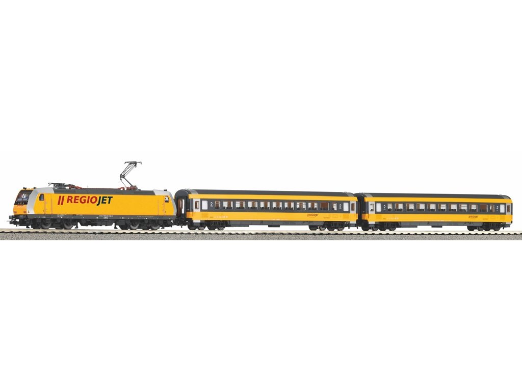 Představujeme vám novinku 2023 Piko Digitální Sada SmartControl WLAN s podložím CZ Osobní vlak Regiojet VI - 59019, digitální soupravu vhodnou pro začátečníky i profesionály modelové železnice. Ve vlakové soupravě je lokomotiva Traxx s dekodérem PIKO a dva osobní vozy RegioJet. Podloží má bezproblémovou montáž i demnotáž na podlaze, nebo na koberci. Její kvalitní provedení slibuje vynikající dráhu, která vydrží. RegioJet a.s. je provozovatel autobusové a osobní železniční dopravy v Česku. Stoprocentní vlastník této společnosti je Student Agency, která na některých nabídkách spolupracovala s německou pobočkou francouzské firmy Keolis. Příležitostnou veřejnou železniční osobní dopravu společnost poprvé prováděla 24. dubna 2010, provoz první linky pravidelné osobní dopravy byl spuštěn 26. září 2011. Sesterská společnost stejného názvu provozuje osobní železniční a autobusovou dopravu (tu od února 2015) na Slovensku. Vozy vznikly jako konkurence dopravy proti Pendolinu Českých drah. Záměrem bylo, aby byla doprava levnější, ale zároveň luxusnější. Specifikace: digitální sadaplocha základny: cca 158 x 88 cmminimální plocha konstrukce: cca 168 x 98 cmtrať s podložímRegiojet elektrická lokomotiva BR 386 1x osobní vozy Regiojet 2x 55412 oblouk R2 s podložím 422 mm 12x 55401 rovné koleje s podložím 231 mm 5x 55406 rovná kolejnice pro spojovací klip 1x 55447 základna pro spojovací klip 1x 55275 spojovací klip 1x propojovací kabel kolejnice 1x PIKO SmartControl WLAN základní sada 1x 55449 PIKO H0 převodník 1x návod k obsluze 1x Hlavní vlastnosti: registrastrační číslo OEEZ: DE24216800napájení DCdigitální ovládáníepocha VIměřítko H0délka vlakové soupravy 745 mmminimální poloměr 358světlo - ANO (měnící se v závislosti směru jízdy)vhodné od 14 letSizing info