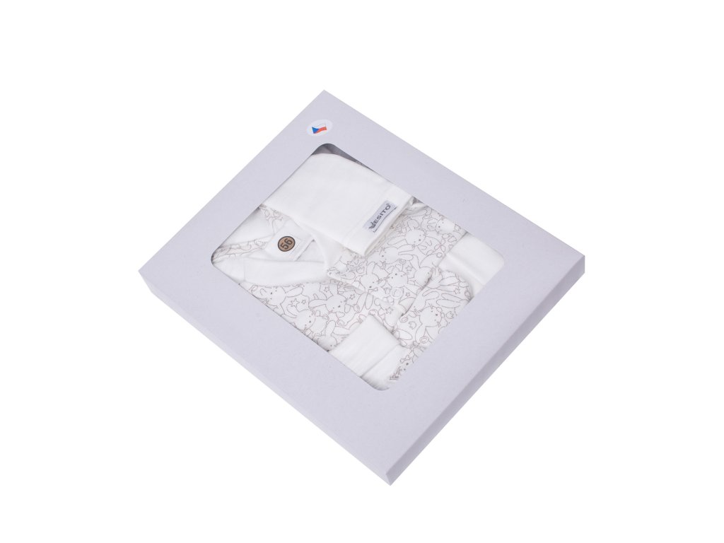 Popis: Pětidílná souprava do porodnice Zája. Krásné provedení kojenecké soupravy do porodnice od českého výrobce kojeneckého oblečení ESITO. Kojenecká souprava do porodnice obsahuje: * Kojenecká čepička (saporka) v barvě slonová kost - velmi pružná a vhodná jako spodní i vrchní. * Zavinovací dětské body v barvě slonová kost pro snadné oblékání i svlékání. * Kalhoty s potiskem Zája moderního střihu, které skvěle padnou s pružným patentem. V pase bez otlaků. * Kabátek s potiskem Zája jako druhá vrstva oblečení (malé miminko má vždy o jednu vrstvu více než dospělák). * Bačkůrky pro miminko Zája z kolekce Zája. Použití: - Ideální jako kompletní souprava do porodnice při odchodu z porodnice a nebo na oslavu jako sladěný komplet. - Vše co souprava obsahuje je zároveň v základní výbavičce pro miminko takže oblečení využijete později i na běžné nošení. Velikosti a rozměry: - 50 a 56 - Velikost novorozenecké soupravy do porodnice vybírejte podle délky miminka v cm. Přičemž velikost se vybírá: velikost miminka do 50 cm = vel. 50, velikost miminka do 56 cm = velikost soupravy 56. Pokud si nejste jistí tak vyberte vel. 56, máte jistotu, že tuto soupravu bude miminko nosit když ne hned tak později, jistě však nebude malá. Materiál: - kabátek, kalhoty, dětské body, bačkůrky: 100% bavlněný úplet Jersey - velmi příjemný materiál - čepička: 96% bavlna a 4% elastan (perfektní pružnost a jemnost čepičky bez otlaků) - náplety okolo rukávů, nožiček a pasu: 96% bavlna + 4% elastan - patenty: ty nejkvalitnější patenty německé výroby zn.YKK, lakované - aby nedošlo ke styku pokožky s kovem Praní a žehlení: - Praní: ANO, na 40°C. - Žehlení: ANO na st **, netřeba žehlit. - Ostatní dle etikety na výrobku. Záruka kvality: - Veškeré kojenecké oblečení pro miminka je navrženo, vyrobeno a zabaleno na území Česka. - Jedná se tedy o 100% český výrobek té nejvyšší kvality, který je skladem k okamžitému vyskladnění. - Samozřejmostí je dvouletá záruka a certifikovaný materiál podle "Oeko-tex Standard 100" pro děti do 3 let. - značkový výrobek ESITO® Kvalitní český výrobek. Vyrobeno s péčí a láskou k dětem v podhůří Orlických hor. Společnost ESITO je český výrobce s vlastním vývojem a stylem. Svou jedinečnost se snaží uplatnit ve svých výrobcích. Její prioritou je nejvyšší možná kvalita, funkčnost, praktičnost a zároveň dobrá cena.Doplňkové parametry