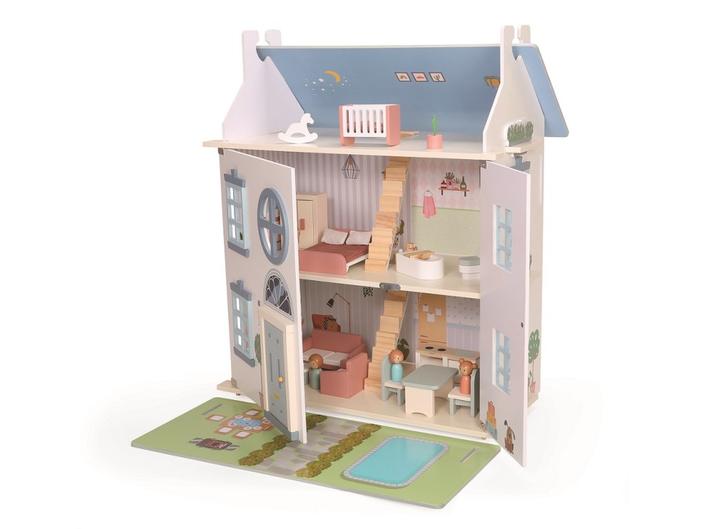 Vítejte v domečku! Na místě, kde příběhy čekají jen na Vás. Díky třem patrům a bohatě prostorným pokojům je pro Vaše malé panenky naprosto ideální. Spolu s rodinkou zde najdete vše, co je u moderní domácnosti zapotřebí – kuchyň, koupelnu, ložnici, obývák i dětský pokoj v podkroví. Sundejte přední část střechy, otočte jí a položte před otevřený domeček a hned máte pro panenky i zahradu s bazénem a nábytkem. Tvořte si rodinné příběhy dle vlastní fantazie! Při hraní děti procvičují komunikační dovednosti, prohlubují sociální interakce a využívají kreativitu Hlavní vlastnosti: oblíbený, tradiční a nadčasový domečekinspiruje k představivé hřetrénuje koordinaci a jemnou motorikuvčetně příslušenství a panenekSizing info