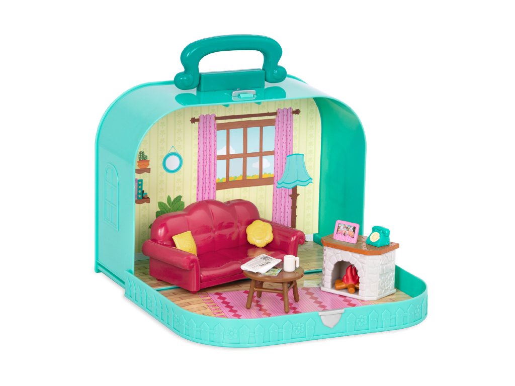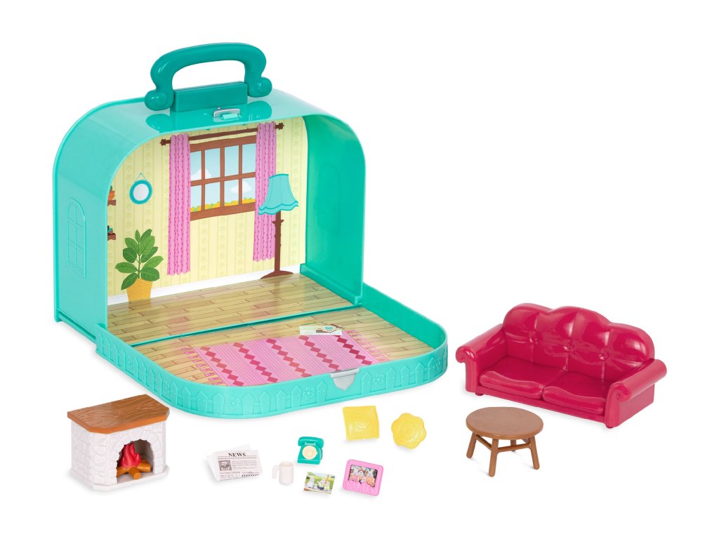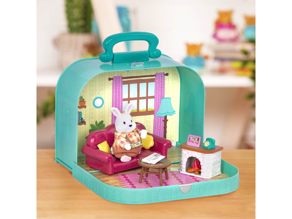 Cestovní sada hraček Li'l Woodzeeze v praktickém kufříku umožní vašemu dítěti hrát si kdekoli na dovolené, výletech či během víkendu u prarodičů. Kufřík se po otevření promění v bohatě vybavený obývací pokoj s nábytkem a doplňky. Samostatně prodávané postavičky zvířátek Li'l Woodzeez jsou vyrobené z měkkého příjemného materiálu a mají pohyblivé ruce, nohy i hlavy pro zábavnou předstíranou hru. Každá postavička má na sobě krásné barevné oblečení. Další domečky, obchody, dopravní prostředky apod. se prodávají samostatně. Všechny postavičky a doplňky Li'l Woodzeez jsou navzájem kompatabilní a umožní vám vytvořit originální městečko pro nekonečnou hru rozvíjející fantazii a kreativitu vašeho dítěte. 13-dílná sada obsahuje kufřík, pohovku, 2 polštáře, rámeček, 2 fotografie, noviny, krb, oheň, konferenční stolek, telefon a hrnek. Rozměry: 23 x 9,2 x 17,5 cm Vhodné pro děti od 3 let.Doplňkové parametry