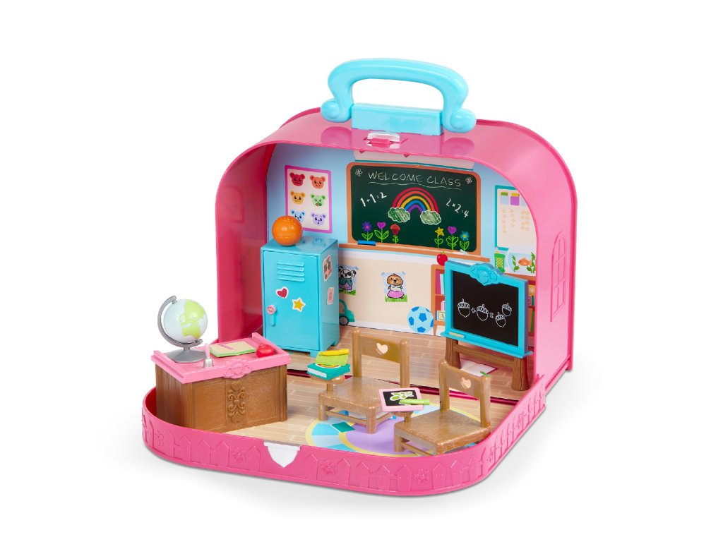 Cestovní sada hraček Li'l Woodzeeze v praktickém kufříku umožní vašemu dítěti hrát si se kdekoli na dovolené, výletech či během víkendu u prarodičů. Kufřík se po otevření promění v bohatě vybavenou školní třídu s nábytkem a doplňky. Samostatně prodávané postavičky zvířátek Li'l Woodzeez jsou vyrobené z měkkého příjemného materiálu a mají pohyblivé ruce, nohy i hlavy pro zábavnou předstíranou hru. Každá postavička má na sobě krásné barevné oblečení. Další domečky, obchody, dopravní prostředky apod. se prodávají samostatně. Všechny postavičky a doplňky Li'l Woodzeez jsou navzájem kompatabilní a umožní vám vytvořit originální městečko pro nekonečnou hru rozvíjející fantazii a kreativitu vašeho dítěte. 17-dílná sada obsahuje kufřík, tabuli, skříňku, dvě židle, stůl, globus, míč, knihy, sešit, psací potřeby, zvonek, jablko, tabulku a samolepky. Rozměry: 23 x 9,2 x 17,5 cm Vhodné pro děti od 3 let.Doplňkové parametry