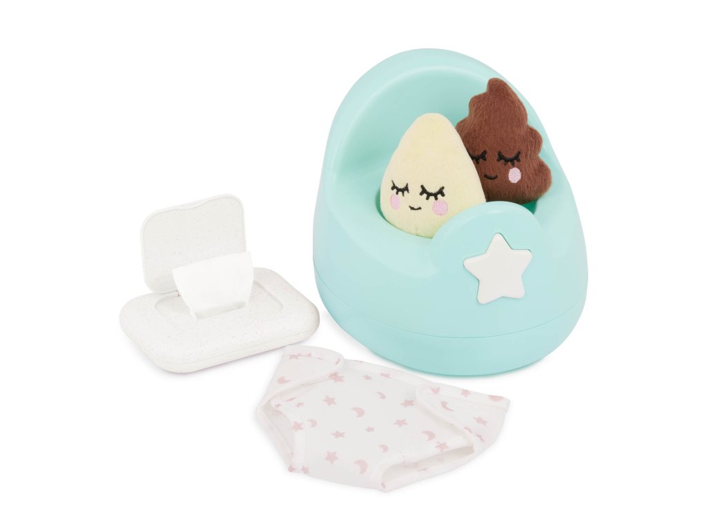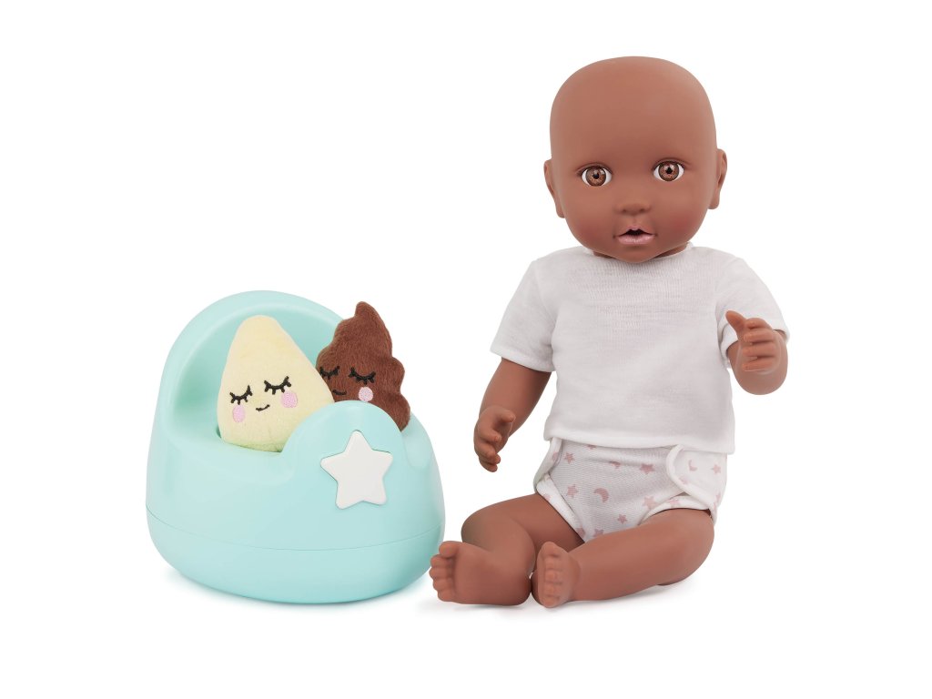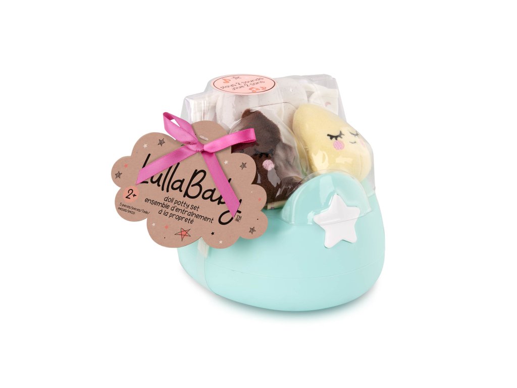 S touto zábavnou tréninkovou sadou LullaBaby vaše děti mohou naučit svou panenku chodit na nočník. Nočník nabízí pro větší zábavu dva veselé zvukové efekty, které podpoří hru na každodenní situace. Součástí sady je kromě nočníku plenka, krabička s ubrousky a dvě plyšové hračky. Sada pomáhá během pečující hry rozvíjet jemnou motoriku, představivost i sociální dovednosti. Vhodné pro většinu panenek velikosti 35 cm. Vyměnitelné baterie 3xAAA součástí výrobku. Panenka není součástí balení. Vhodné pro děti od 2 let.Doplňkové parametry
