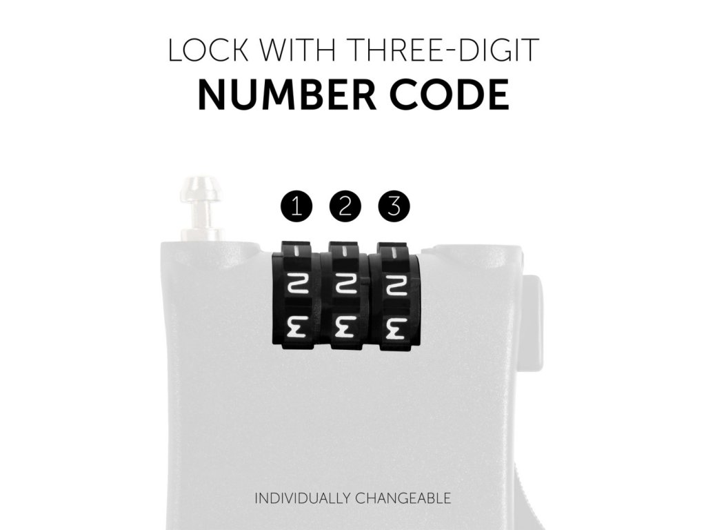 Snadná manipulace díky libovolně nastavitelné kombinaci čísel. Zámek má 65 cm dlouhé ocelové lanko s funkcí automatického navíjení.