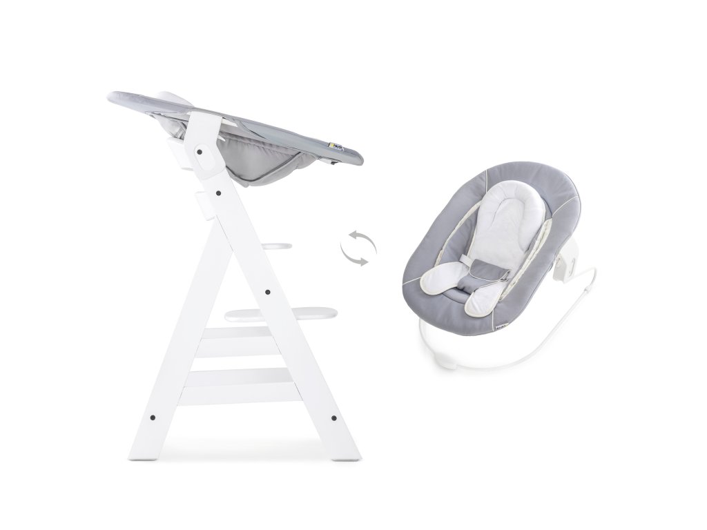 Křesílko 2v1 Alpha nabízí dvě funkce použití: lze jej používat jako houpátko na dodaném houpacím rámu nebo jej lze připojit k dřevěné vysoké židličce Alpha+ jako nástavec pro novorozence. Dítě je tak od narození přítomno u jídelního stolu a může se účastnit dění v rodině.