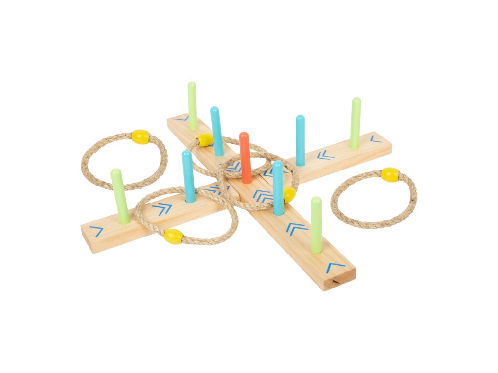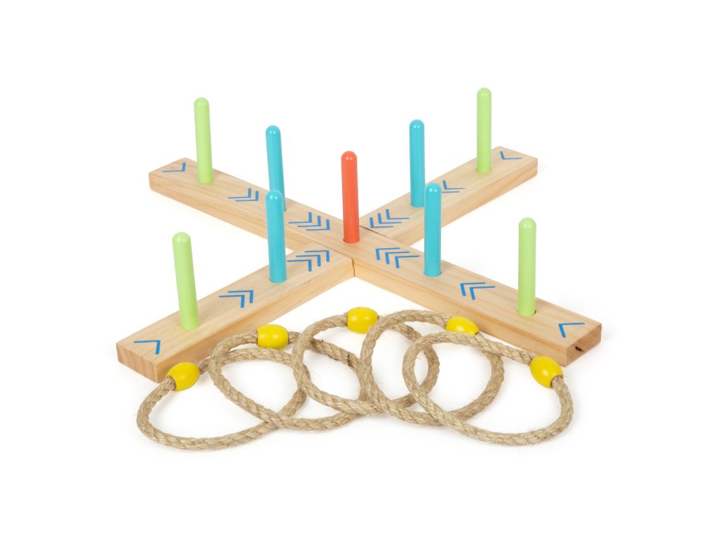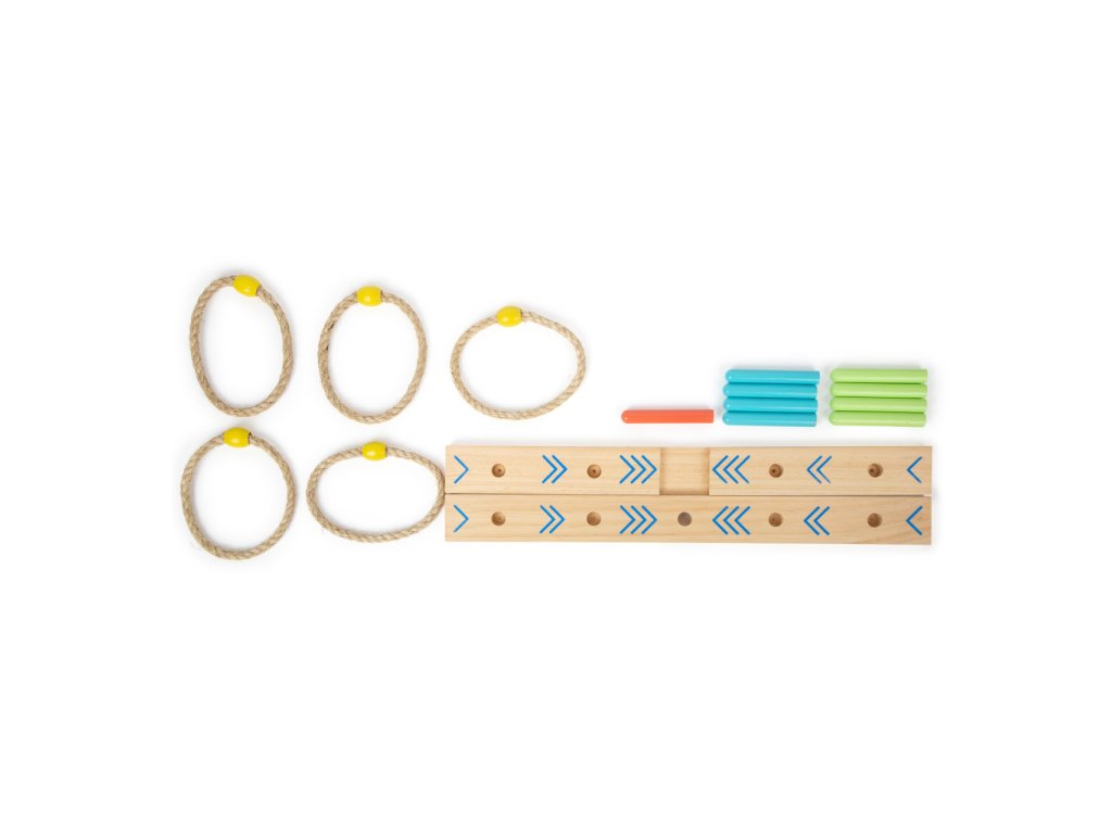 Kdo má nejlepší mušku? V této hře házení krůhu musíte trefit pletené kroužky na 9 kolíků dřevěné základny. Skóre vypočítáte podle barevných šipek, body tak spočítají i děti, které ještě neumí poznávat čísla. Hru lze jednoduše složit a zase rozložit, můžete ji skladovat v bavlněném pytlíku s poutkem, v kterém je od výroby zabalena. Perfektní hra, s kterou si děti užijí mnoho hodin zábavy. Trénuje koordinaci ruka-oko a zručnost. Základna je vyrobena ze 100% certifikovaného FSC® dřeva. Hlavní vlastnosti: házecí hra pro celou rodinu9 kolíků a 5 házecích kruhůpletené kruhy jsou jednoduše uchopitelnébody lze spočítat i bez znalosti číselrychlá montážideální pro procvičování přesnosti hodumoderní design „Active“ Značka a certifikát FSC® (Forest Stewardship Council) zaručuje, že dřevo, ze kterého byl produkt vyroben, nebylo vytěženo nelegálně a pochází z lesů obhospodařovaných šetrným či přírodě blízkým způsobem, ve kterém jsou dodržovány přísné environmentální a sociální požadavky. Značka FSC® na výrobku znamená, že svým nákupem pomáháte chránit lesy a podporujete šetrné, odpovědné či přírodě blízké hospodaření, díky kterému jsou naše lesy stabilnější, zdravější, mají přirozenou druhovou skladbu a lépe odolávají negativním následkům klimatických změn.Sizing info