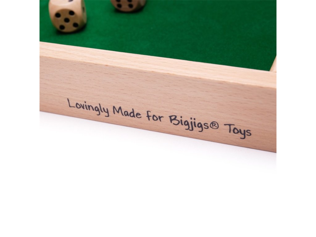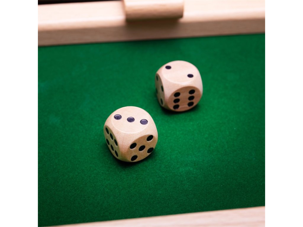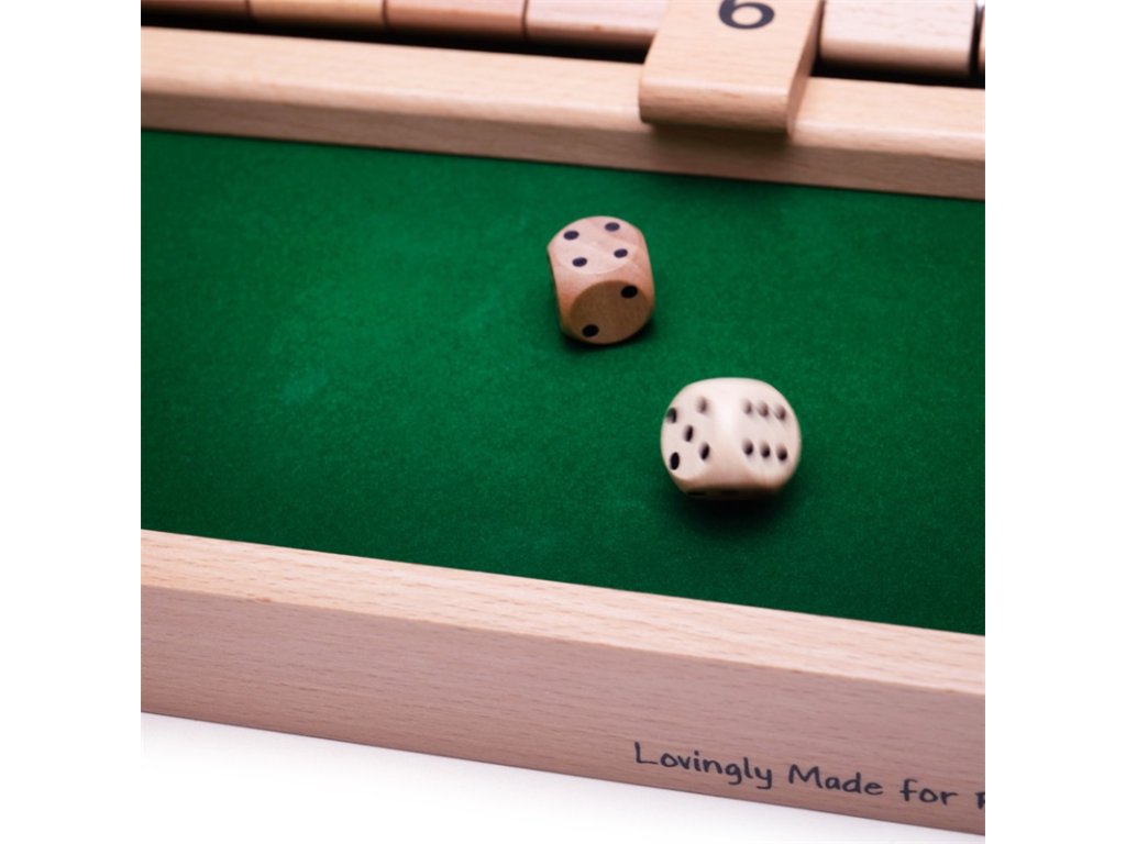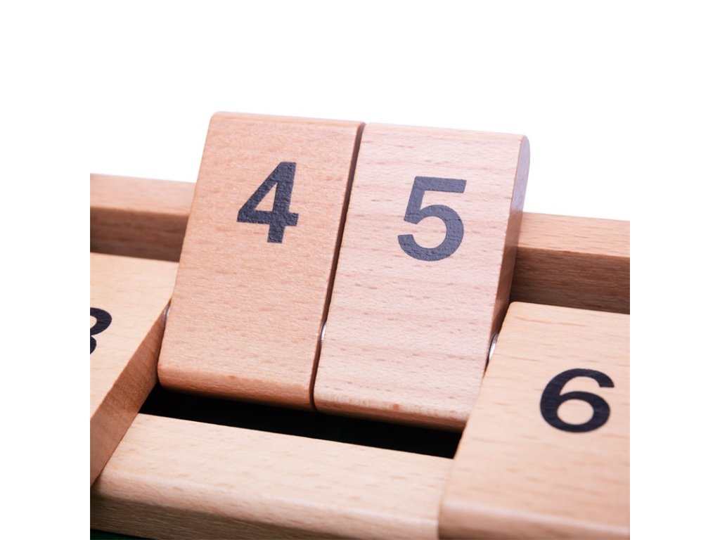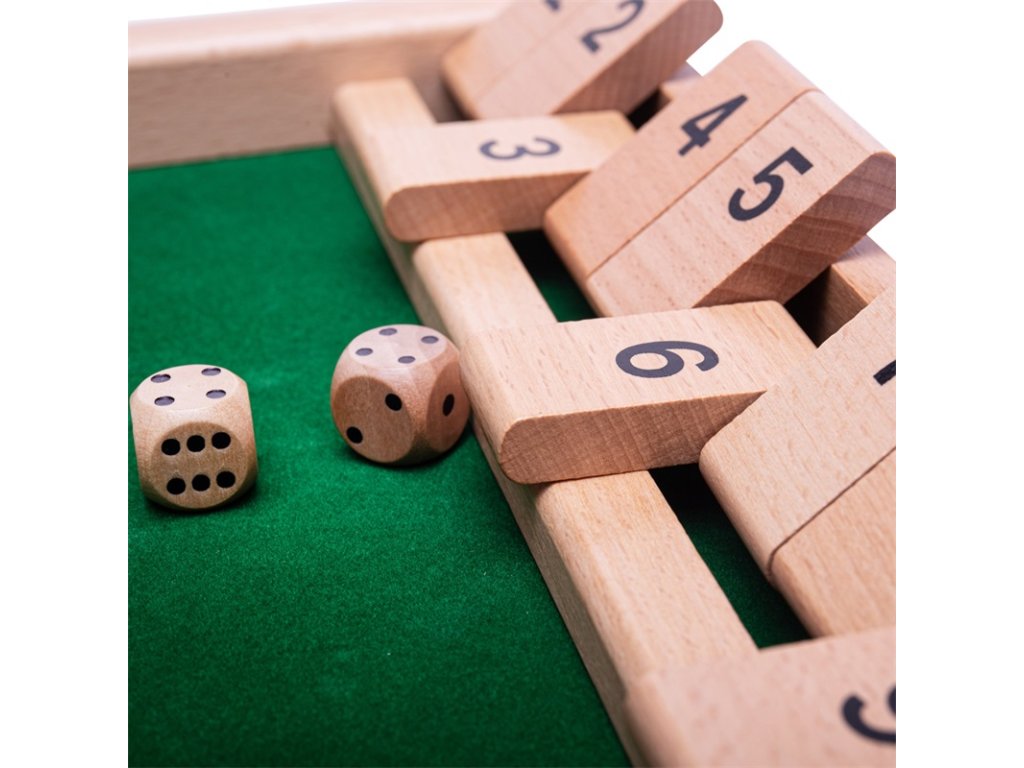 Zábavná hra, která dětem zlepší jejich numerické dovednosti. Hoďte dvojicí kostek a zavřete destičky, (maximálně dvě) které se rovnají celkovému počtu hodů kostkou. Pokračujte ve hře dokud nebude možné zavřít žádné další destičky. Zbylý součet neotočených destiček si zapište. Hraje se do určeného počtu trestných bodů, zpravidla do 200, vyhrává pak hráč s nejmenším počtem trestných bodů. Vzdělávací a zábavná hra, může ji hrát jeden nebo více hráčů. Tato dřevěná verze hry v tradičně vyrobeném dřevěném rámu s plstěnou hrací deskou. Vyrobeno z vysoce kvalitních, zodpovědně získaných materiálů. Splňuje aktuální evropské bezpečnostní normy. Skládá se ze 3 hracích prvků. Hlavní vlastnosti: hra pro jednoho nebo více hráčůobsahuje 2 kostky a hrací deskupodporuje matematické dovednostiSizing info