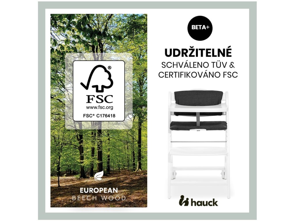 UDRŽITELNÉ BUKOVÉ DŘEVO S CERTIFIKÁTEM FSC® // Jídelní židlička Beta+ je vyrobena z evropského bukového dřeva pocházejícího z lesů s certifikací FSC®, která oceňuje udržitelné a ekologické lesní hospodářství na ochranu rostlin a živočichů.