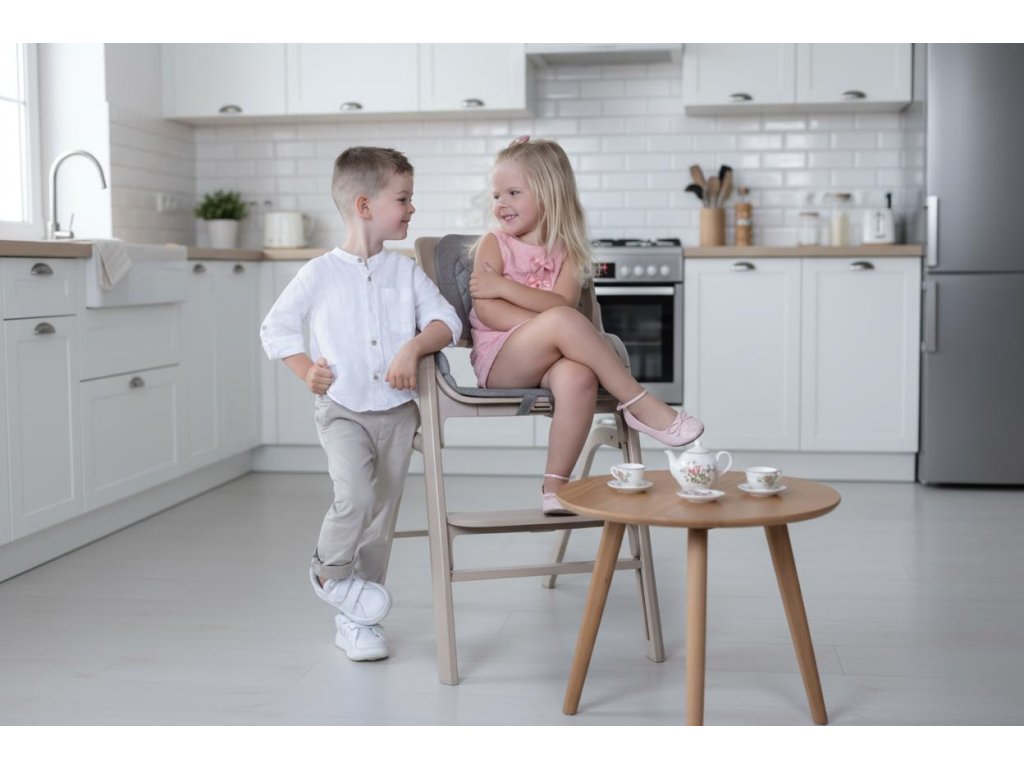 Jakmile miminko začne samostatně sedět, jednoduše set odejmete a přejdete na klasickou židličku s praktickým odnímatelným pultíkem. Výškově nastavitelný sedák i opěrka nohou umožňují ergonomické sezení po celou dobu růstu.
