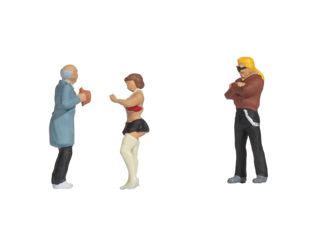 Tato odlehčená a lehce provokativní scénka přenáší dění z noční ulice přímo do vaší modelové krajiny.Starší muž v poněkud rozpačitém postoji je osloven sebevědomou dámou v nápadném oblečení, která se očividně nebojí navázat konverzaci. Nedaleko stojí další muž se založenýma rukama a výrazem, který naznačuje, že situaci pečlivě sleduje. Ideální doplněk pro městské prostředí nebo méně osvětlená zákoutí vaší železnice, který jistě vyvolá úsměv i pobavení. Scéna vnáší do modelového světa špetku městského života, nadsázku i všední realitu s humorem. Detailní zpracování a charakter jednotlivých postav přináší do každého diorámatu živost a příběh. Hlavní vlastnosti: jedná se o model, nejedná se o hračkuručně kolorovánovhodné od 14 letměřítko H0Sizing info