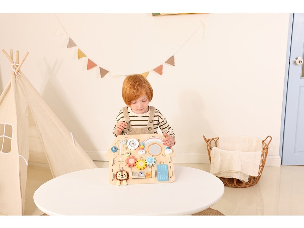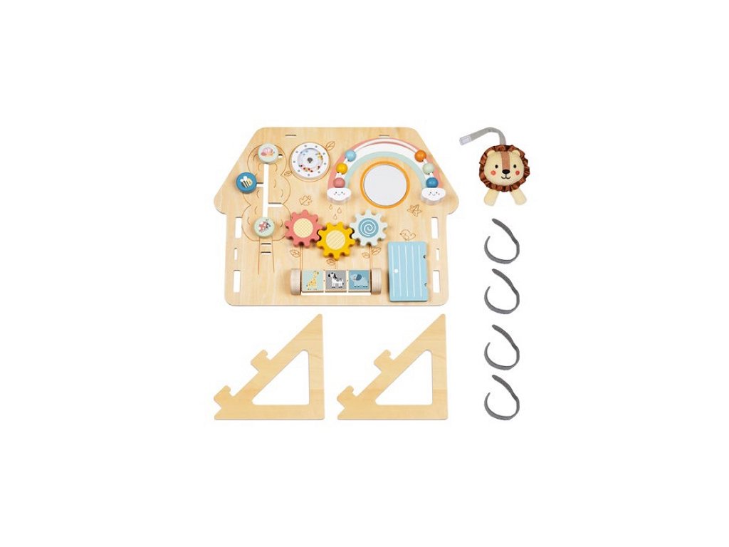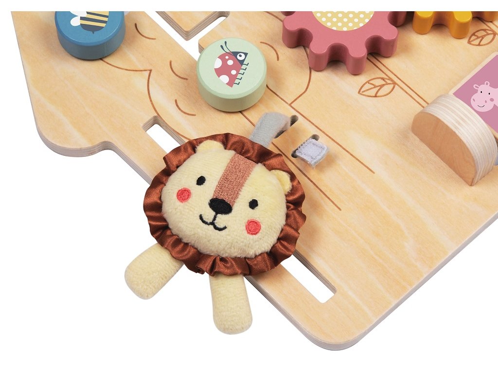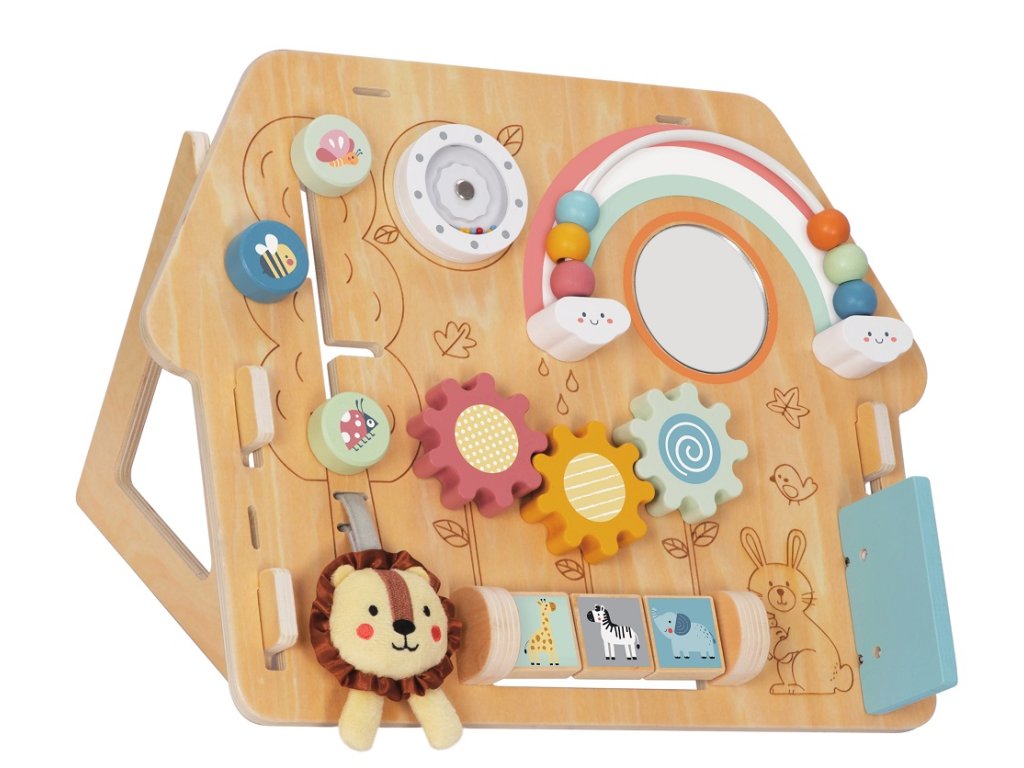 Tato hrací deska ve tvaru domečku s motivem lvíčka přináší spoustu zábavy, díky které bude moci Vaše dítě rozvíjet zručnost, zvídavost a jemnou motoriku. Různé aktivity jako je korálkový labyrint, ozubená kolečka, otáčecí a posuvné destičky s obrázky zvířátek a další dávají dítěti možnost procvičovat otáčení, otevírání či zavírání a připravit se tak na úkony každodenního života. Jemné barvy, roztomilé obrázky, zvuky, jako je chrastění perliček, a rozdílné textury povrchů stimulují smyslové vnímaní dětí. Deska je opatřena praktickými podpěrami ve tvaru trojúhelníku a je vyrobena ze dřeva s certifikací FSC®. Hlavní vlastnosti: podporuje jemnou motoriku a koordinaci ruka-okopodněcuje představivostsenzorická stimulacevyrobeno ze dřeva s certifikací FSC® vhodné od 1 roku věku Značka a certifikát FSC® (Forest Stewardship Council) zaručuje, že dřevo, ze kterého byl produkt vyroben, nebylo vytěženo nelegálně a pochází z lesů obhospodařovaných šetrným či přírodě blízkým způsobem, ve kterém jsou dodržovány přísné environmentální a sociální požadavky. Značka FSC® na výrobku znamená, že svým nákupem pomáháte chránit lesy a podporujete šetrné, odpovědné či přírodě blízké hospodaření, díky kterému jsou naše lesy stabilnější, zdravější, mají přirozenou druhovou skladbu a lépe odolávají negativním následkům klimatických změn.Sizing info