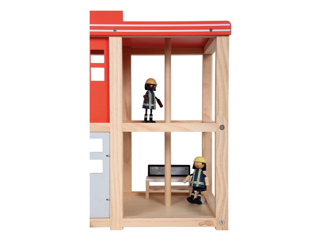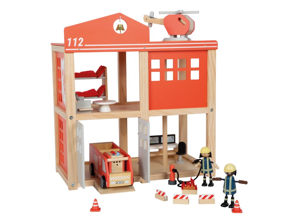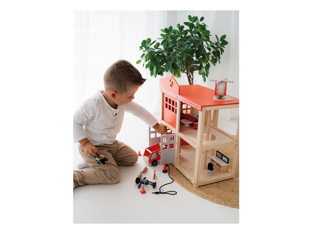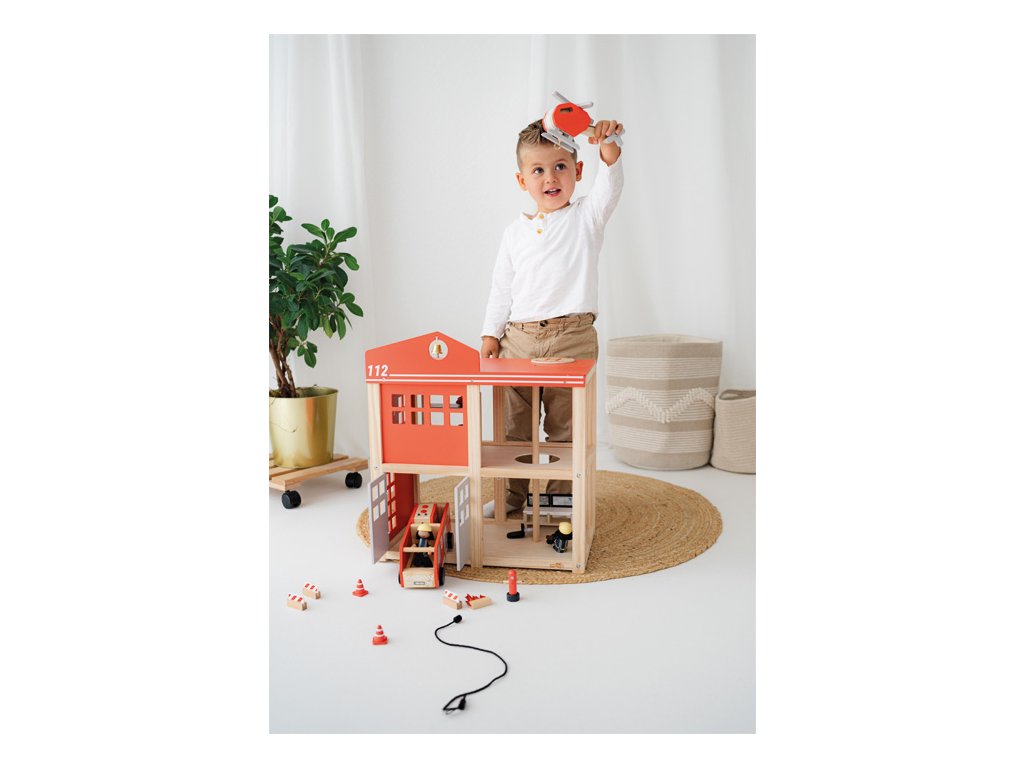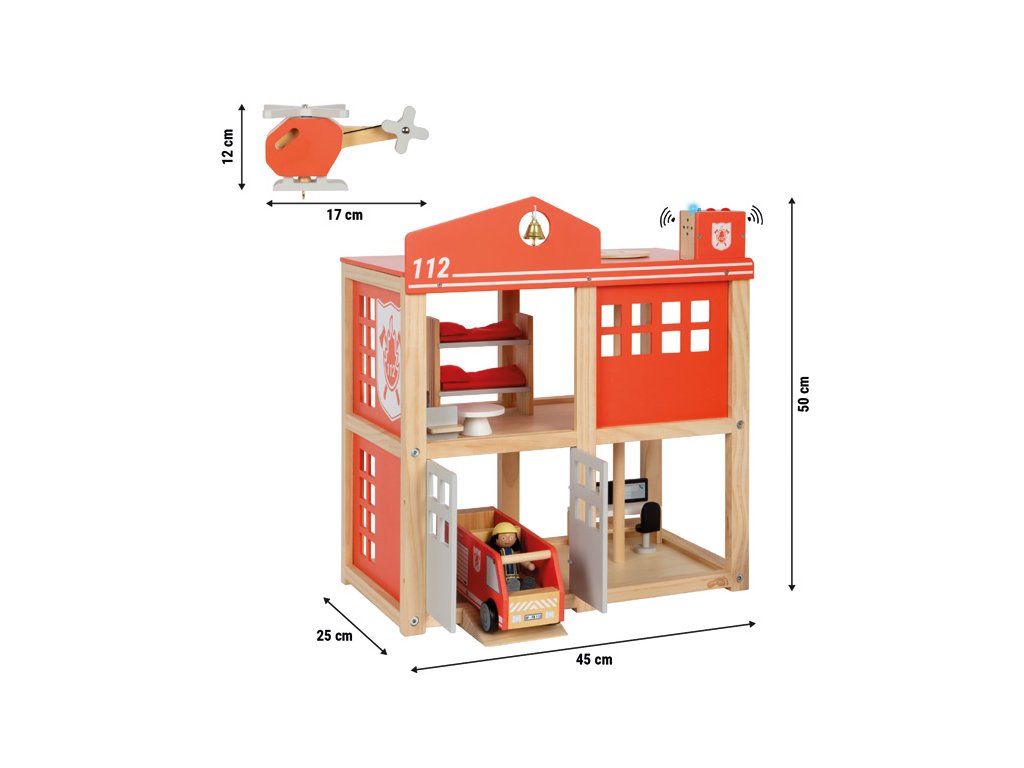 Velká dřevěná hasičská stanice XXL se stane srdcem každého dětského pokoje!Díky bateriovému světelnému a zvukovému panelu si děti mohou užít realistické mise – se skutečnou sirénou a blikajícími světly jako u opravdových hasičů. Modul lze navíc použít na stanici i na hasičském voze, takže zábava nikdy nekončí. Součástí sady je hasičský vůz, vrtulník s funkčním navijákem a dvě ohýbací postavičky hasičů, které jsou připravené vyrazit do akce. Nechybí ani hydrant s hadicí, požární výsuvný panel, stožáry a závorové brány pro napínavé zásahy. Uvnitř stanice děti najdou velitelské centrum a odpočinkovou místnost s patrovou postelí, pohovkou a konferenčním stolkem – vše jako u skutečných hasičů! Do dílny mohou malí hrdinové vjet hasičským autem přes rampu a dveře, zatímco otevřený design stanice umožňuje snadný přístup ze všech stran – ideální pro společné hraní více dětí.Tato propracovaná dřevěná hasičská stanice nabízí dětem nekonečné příběhy, rozvíjí fantazii, motoriku i představivost a přináší do hry spoustu reálných zážitků! Hlavní vlastnosti: velká dřevěná hasičská stanice se zvonkem a sadou příslušenství napájení na baterie 2x AAA (nejsou součástí balení)vhodné pro děti od 3 letotevřený design pro snadný přístup ke hranírozvíjí fantazii, motoriku i představivostSizing info