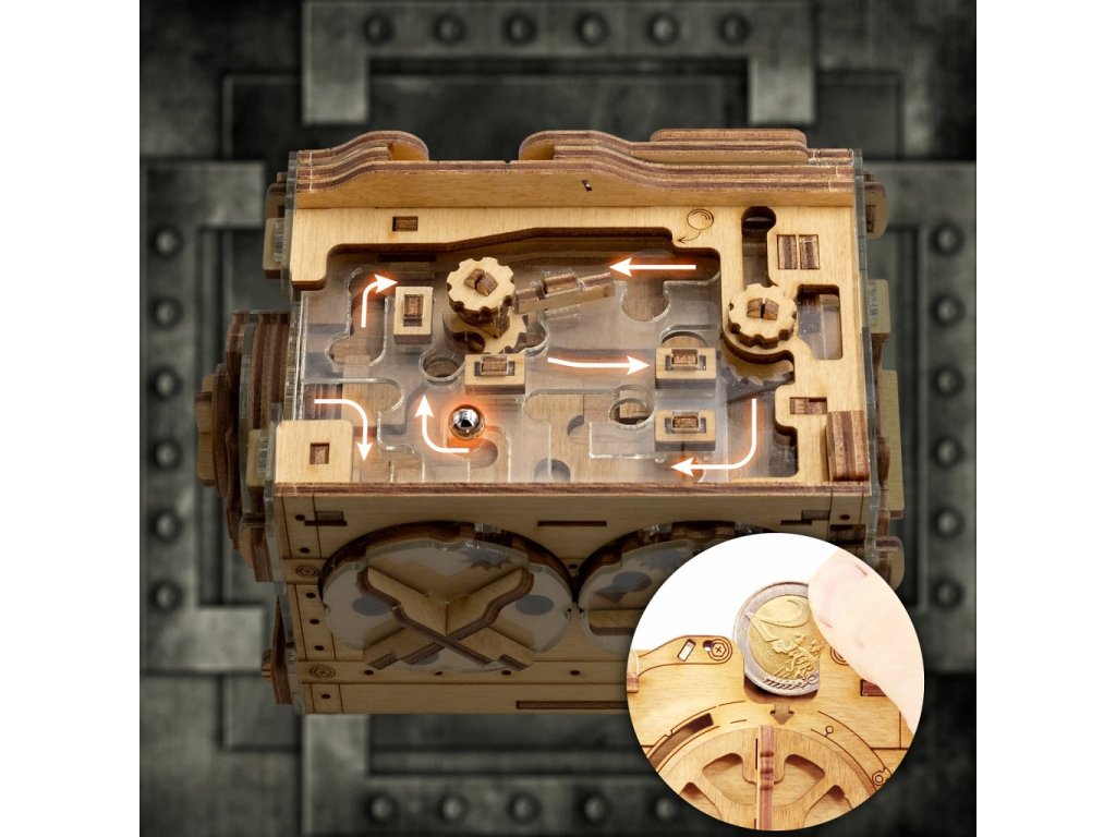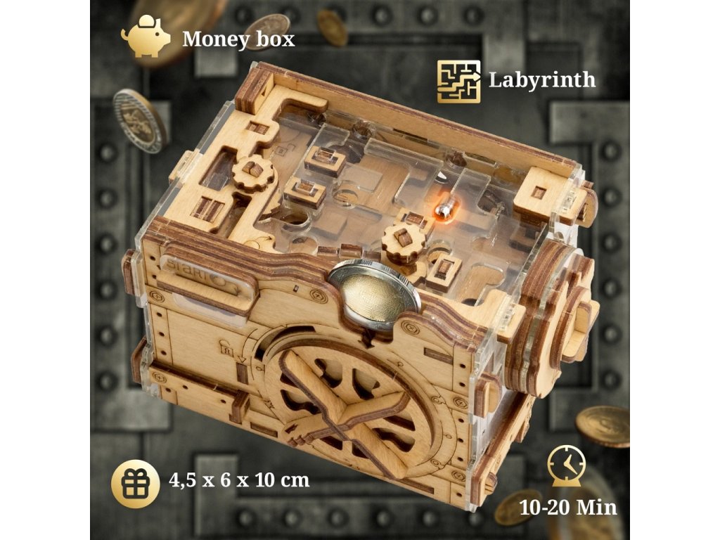 Jste fanouškem hlavolamů? Pak je tato bludištní pokladnička ideální právě pro Vás! Pro spuštění potřebujete pouze jednu minci. Hlavní vlastnosti: trezor a labyrint v jednomhrací doba 10-20 minutvhodné jako kreativní dárekSizing info