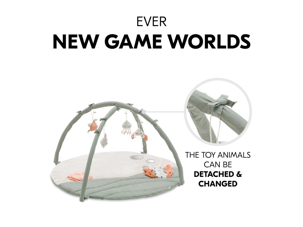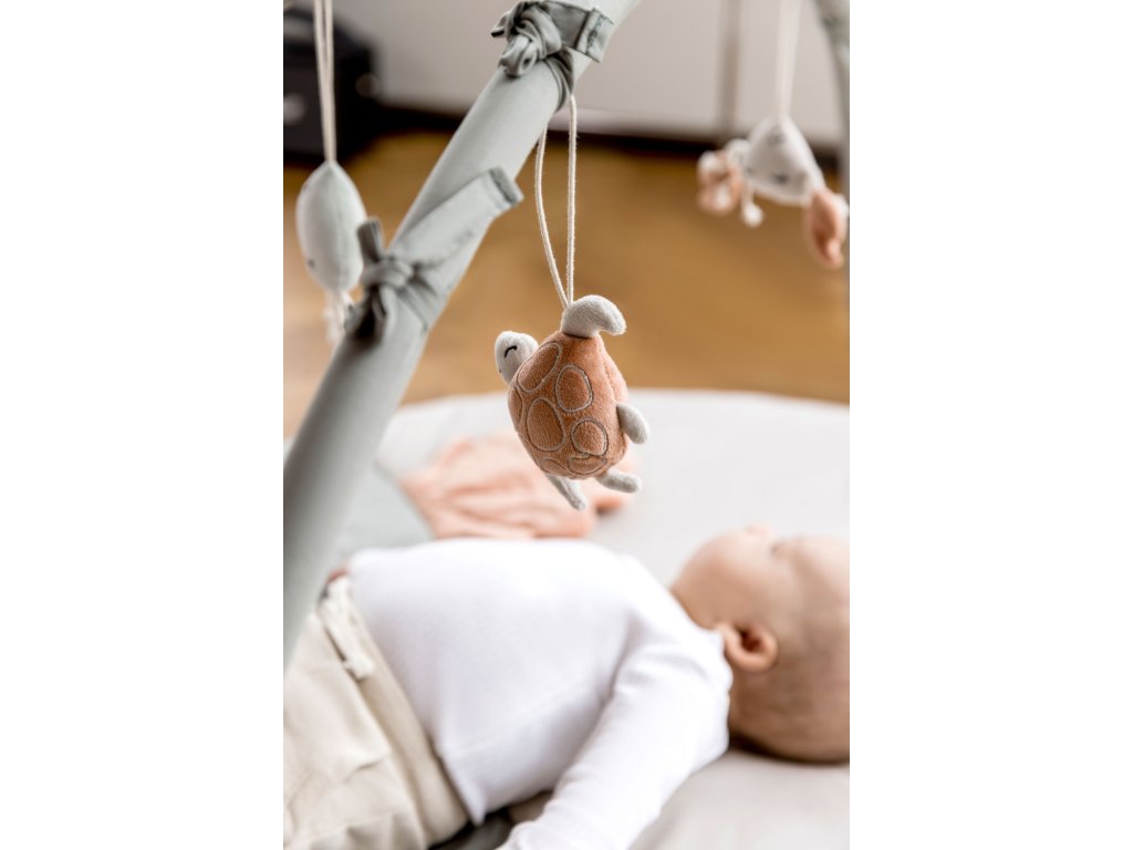 Pískající krab, chrastící medúza, vyšívaná mušle a želva se zrcátkem : každé zvířátko je možné sundat, vyměnit, takže se svět kolem vašeho miminka bude neustále měnit.